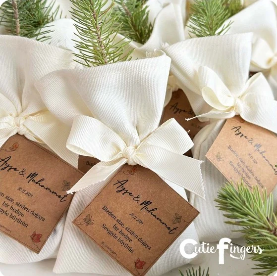 Zarif beyaz kumaş kesesi ve fiyonk detaylarıyla hazırlanan Leylandi fidanları nikah, düğün ve nişan davetleriniz için şık ve anlamlı bir hediye alternatifidir. Kese üzerine isim–tarih baskılı minik kart eklenir; her misafiriniz, yanına minik bir doğa hatırası götürür.