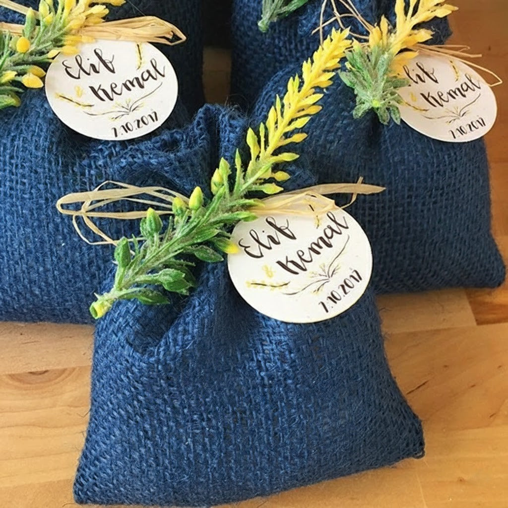 Tüm keseler isim–tarih baskılı etiket veya mühür seçenekleriyle kişiye özel hazırlanır. Nişan, söz, kına ve düğün masalarına zarif bir anı olarak eşlik eder.