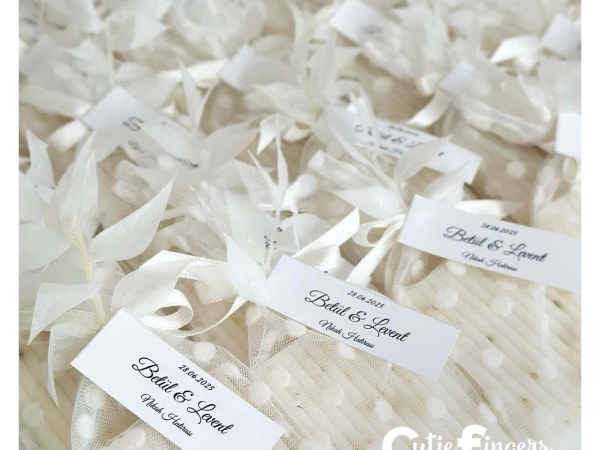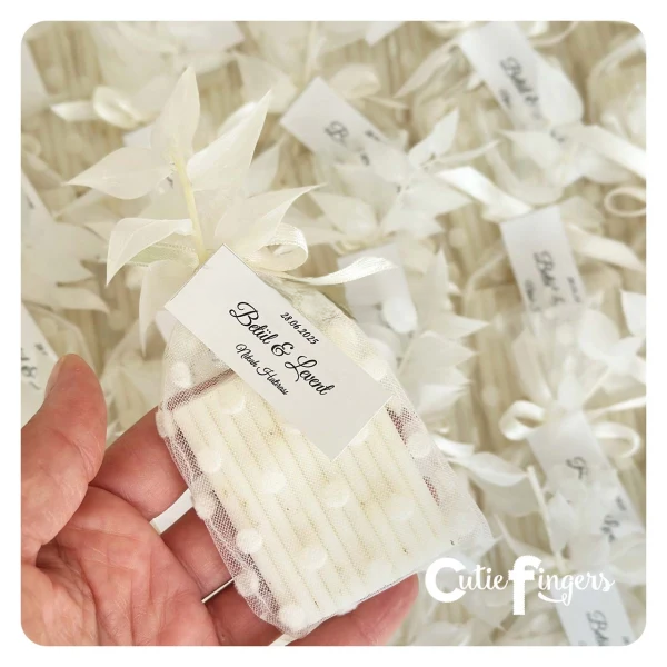 Cutie Fingers’ın tül kesede hediyelik sabunu, zarif beyaz tül ve yaprak detayıyla şık bir ilk izlenim bırakır. Hoş kokusu, el yapımı sabunun temiz içerikli formülü ve özenli paketlemesiyle birleşerek nikah ve nişan masalarınıza sade bir zarafet katar.