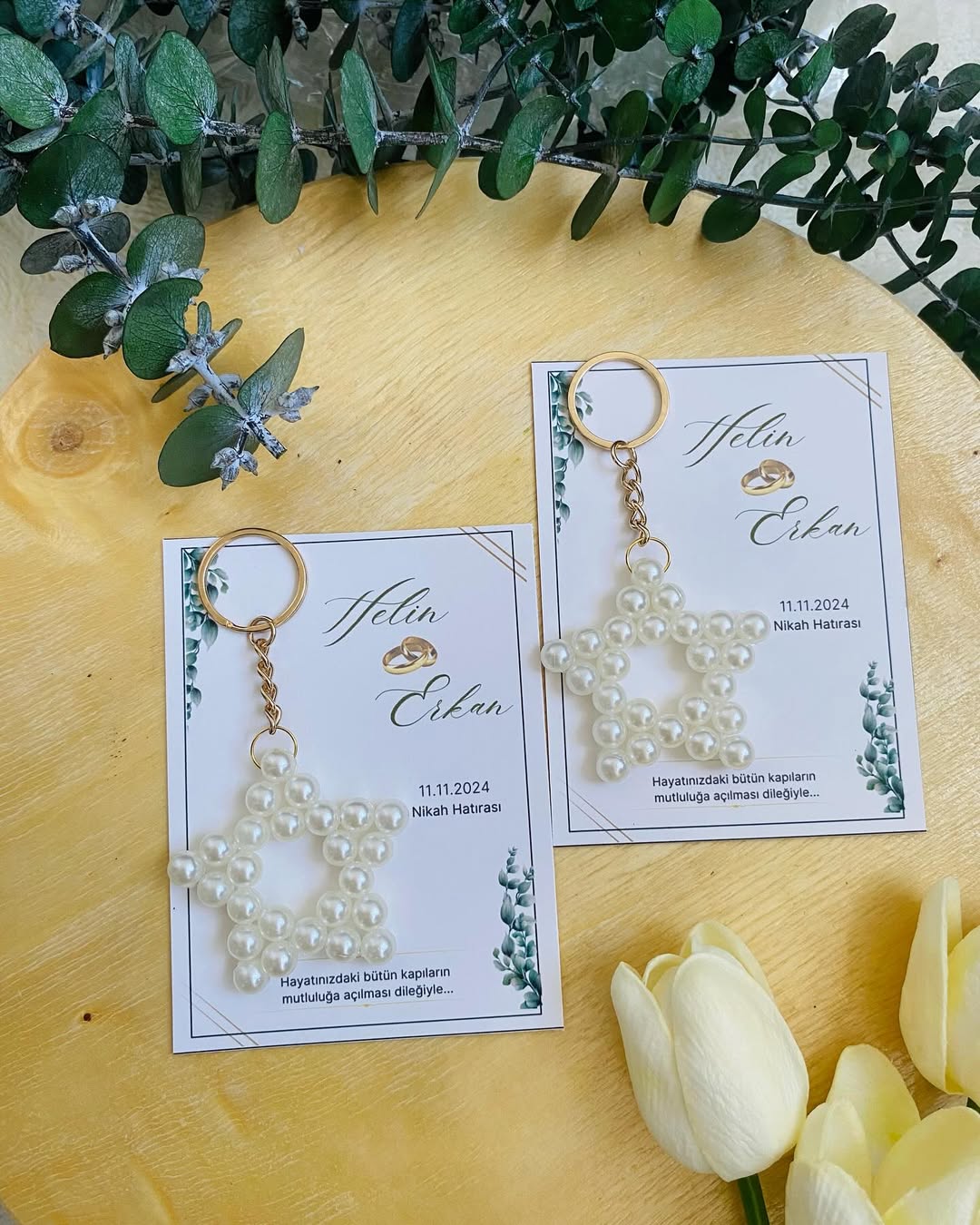 My Design üretimi, inci görünümlü boncuklarla elde örülmüş yıldız anahtarlıklar; altın renk halkası ve isim–tarih baskılı kartıyla hem şık hem de kalıcı bir hatıra.