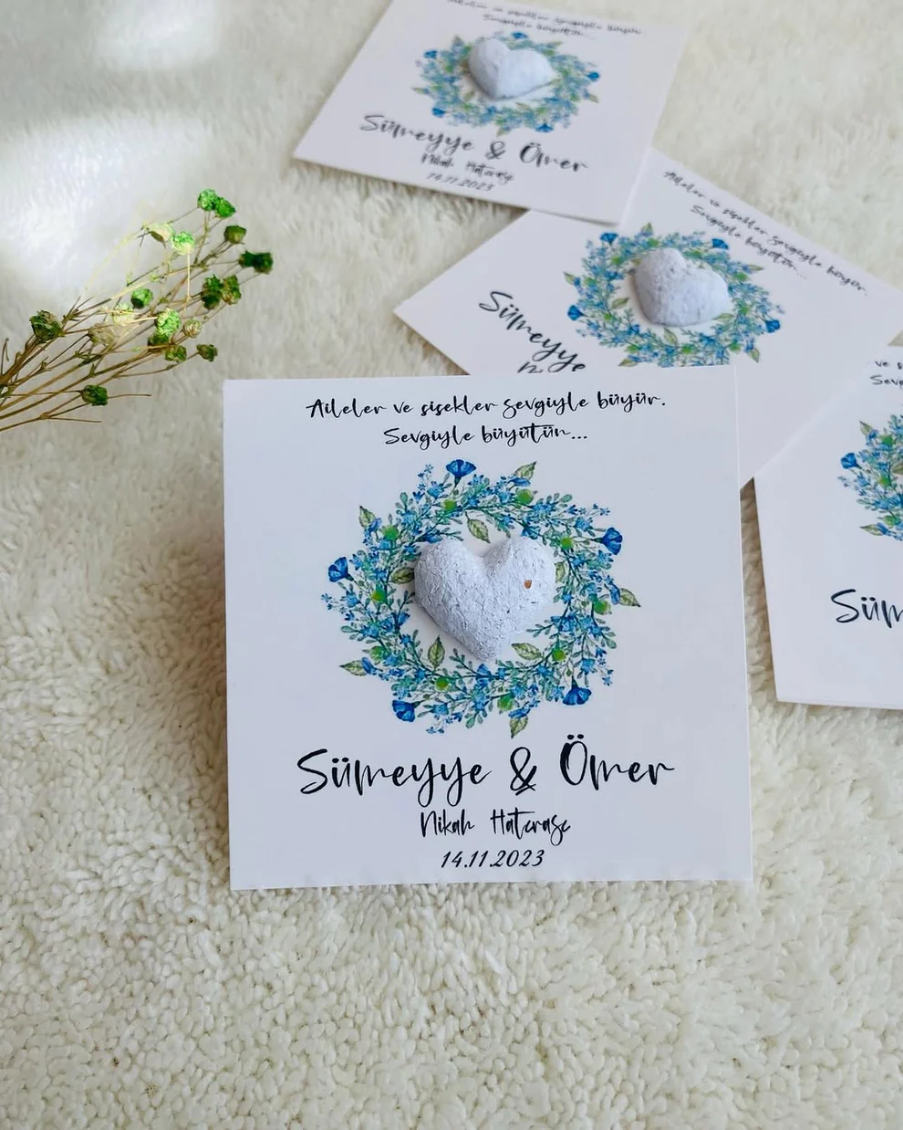 Aşkınız çiçek açsın! Geri dönüştürülmüş kağıtlarla kalp ve çiçek formunda tohum bombası ile hazırlanan bu kartlar, isim–tarih baskılı ve tamamen size özel üretilir. Davetinizden sonra misafirleriniz tohumu 1 gün suda bekletip toprağa ektiklerinde çiçekler açar.