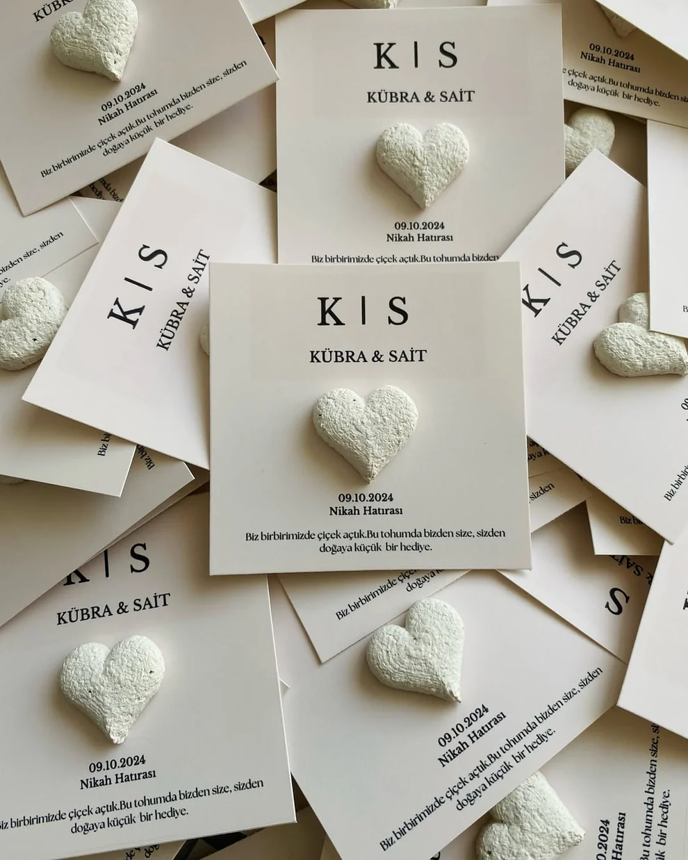 Aşkınız çiçek açsın! Geri dönüştürülmüş kağıtlarla kalp ve çiçek formunda tohum bombası ile hazırlanan bu kartlar, isim–tarih baskılı ve tamamen size özel üretilir. Davetinizden sonra misafirleriniz tohumu 1 gün suda bekletip toprağa ektiklerinde çiçekler açar.