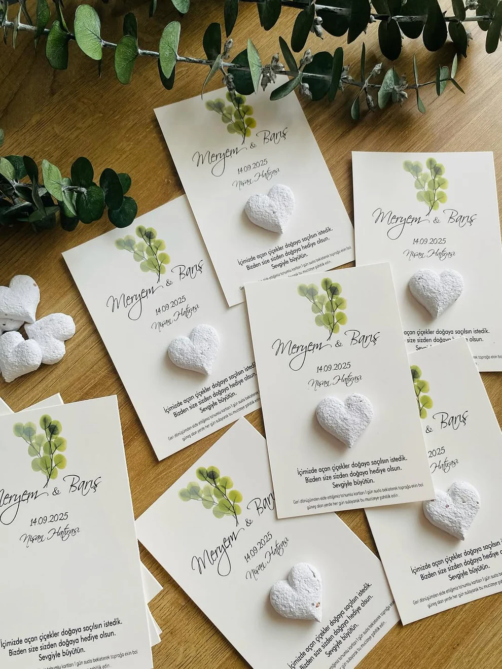 Geri dönüştürülmüş kağıda yerleştirilen kalp/yaprak formundaki tohum bombası ile hazırlanır. İsim–tarih baskılıdır ve misafirleriniz karttaki tohumu 1 gün suda bekletip toprağa hafifçe gömerek, düzenli nem verip gün ışığında filizlendirebilir. Hem hatıra hem de doğaya minik bir armağan!