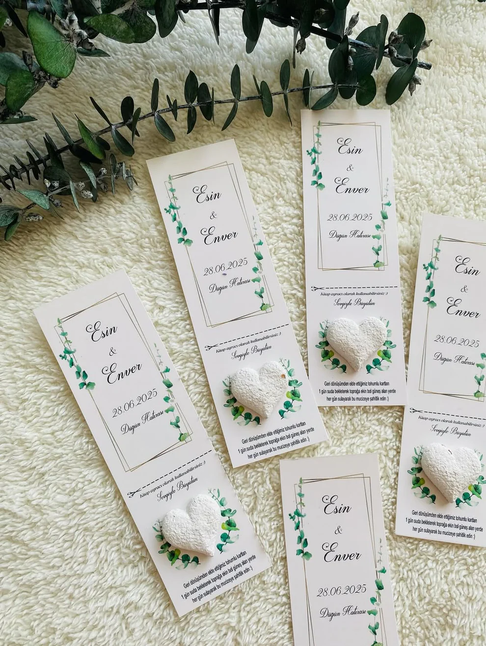 Sevginiz çiçek açsın! Geri dönüştürülmüş kağıtla hazırlanmış kalp ve çiçek formlu tohum bombası kartları, isim–tarih kişiselleştirmesiyle davetlerinize hem anlam hem doğallık katar. Misafirleriniz karttaki tohumu eve götürüp toprağa ekerek bu özel günü yıllarca hatırlar.