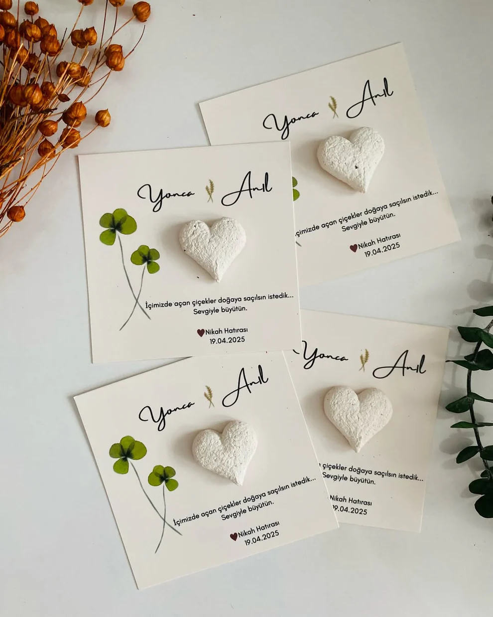 Aşkınız çiçek açsın! Geri dönüştürülmüş kağıtlarla kalp ve çiçek formunda tohum bombası ile hazırlanan bu kartlar, isim–tarih baskılı ve tamamen size özel üretilir. Davetinizden sonra misafirleriniz tohumu 1 gün suda bekletip toprağa ektiklerinde çiçekler açar.