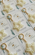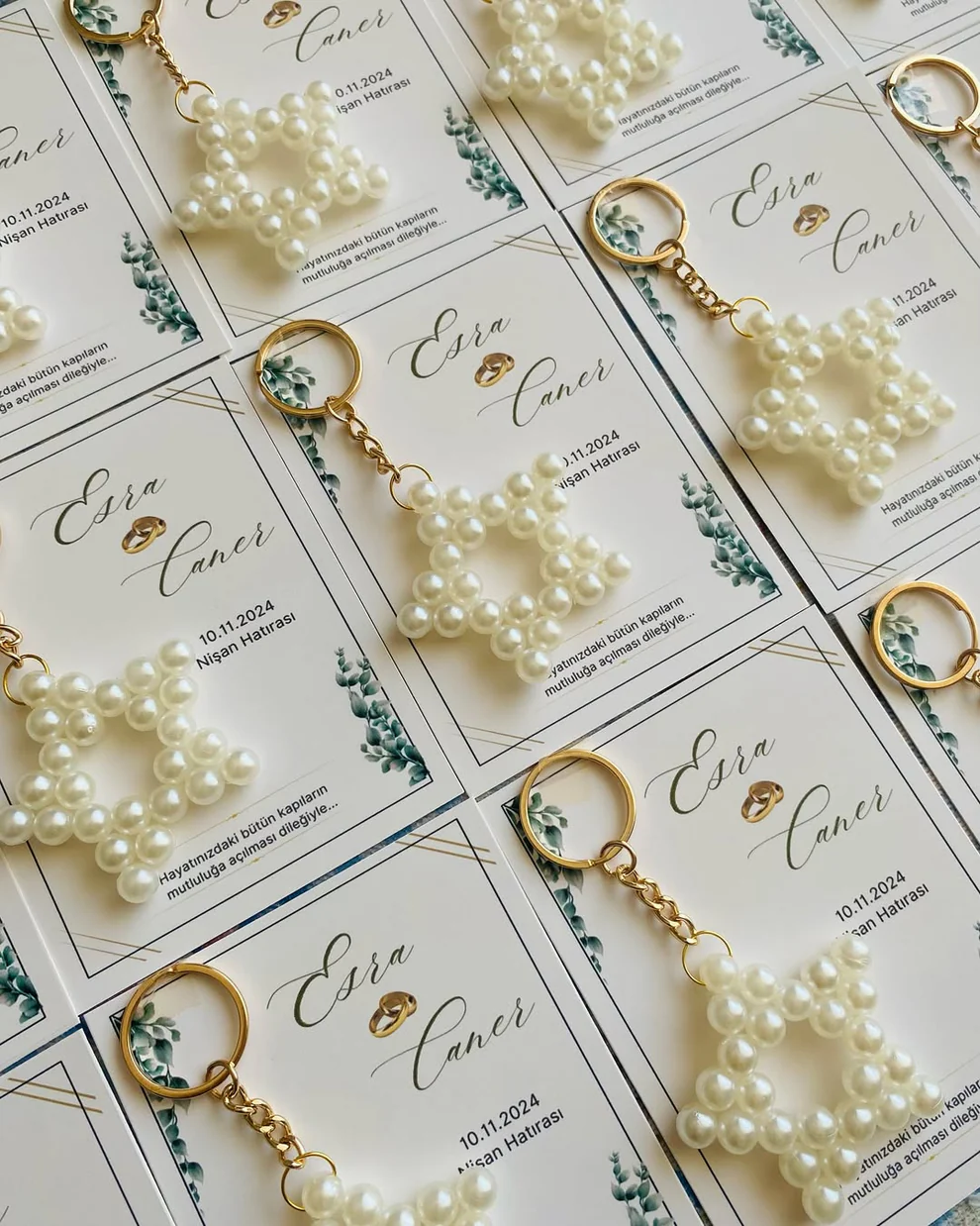 My Design üretimi, inci görünümlü boncuklarla elde örülmüş yıldız anahtarlıklar; altın renk halkası ve isim–tarih baskılı kartıyla hem şık hem de kalıcı bir hatıra. Dilerseniz kart üzerinde ekilebilir çiçek tohumu kalp dokunuşu ve takvim detayıyla günü ölümsüzleştirebilirsiniz.