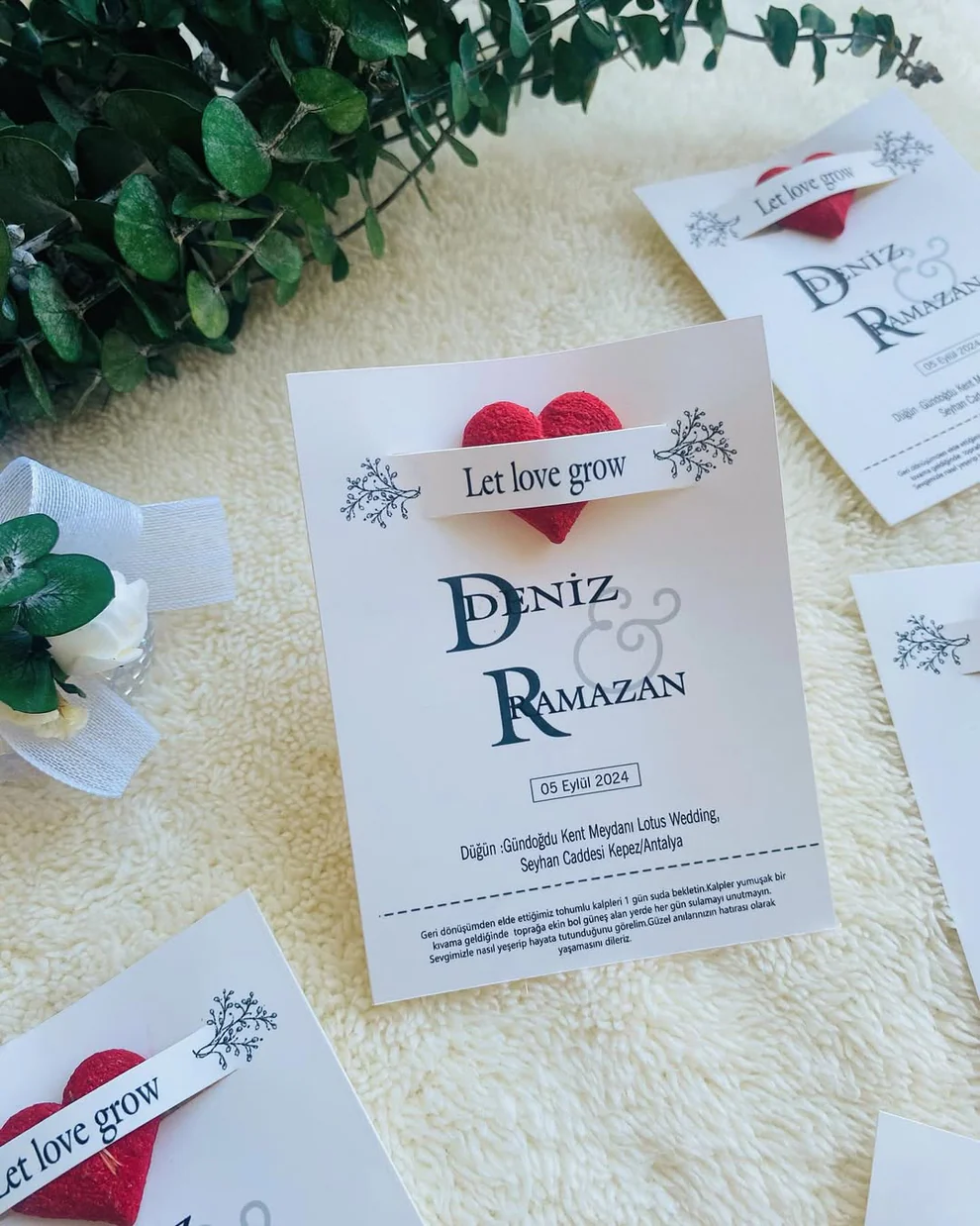 Geri dönüştürülmüş kağıda yerleştirilen kalp/yaprak formundaki tohum bombası ile hazırlanır. İsim–tarih baskılıdır ve misafirleriniz karttaki tohumu 1 gün suda bekletip toprağa hafifçe gömerek, düzenli nem verip gün ışığında filizlendirebilir. Hem hatıra hem de doğaya minik bir armağan!