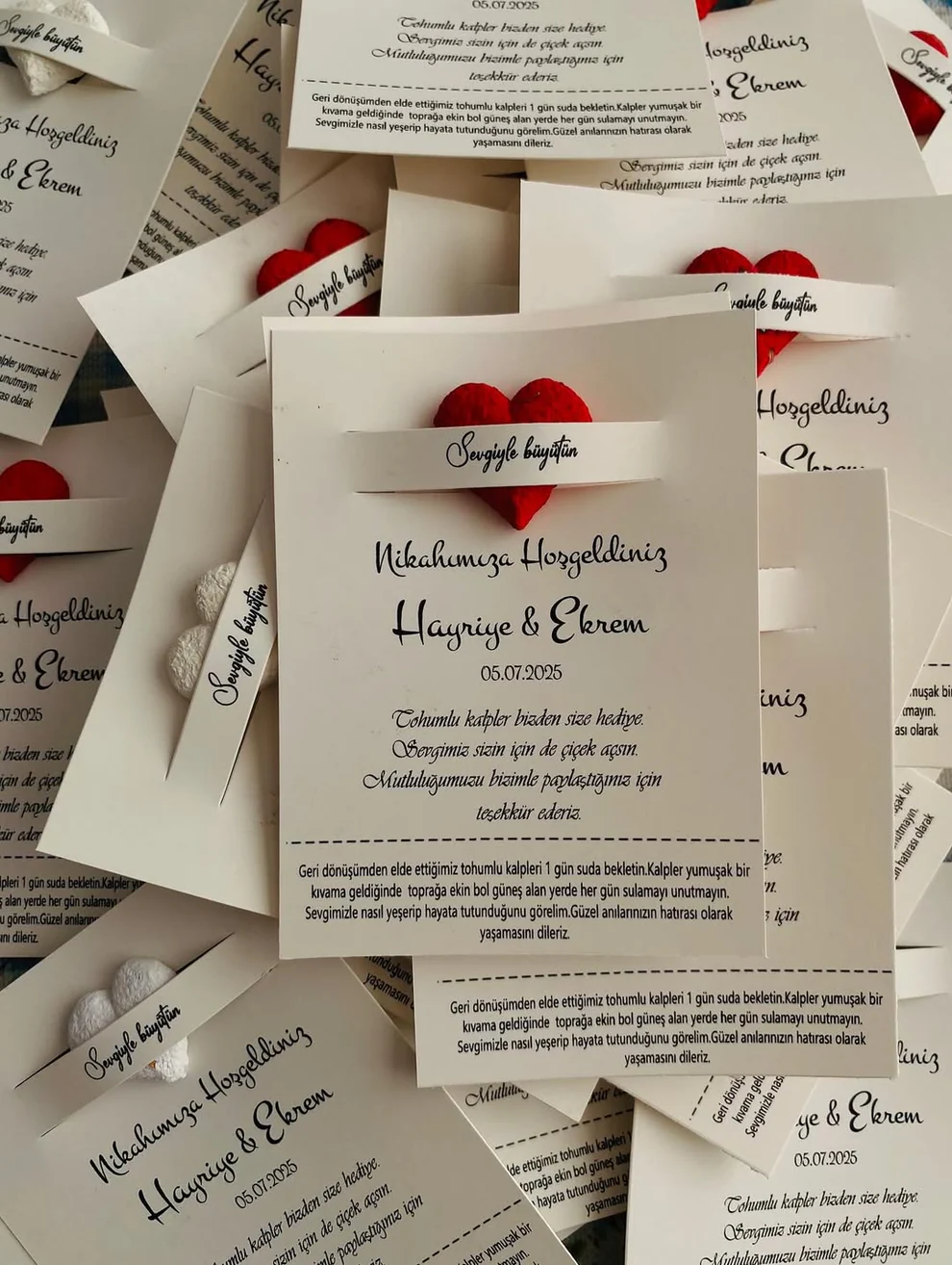 Geri dönüştürülmüş kağıda yerleştirilen kalp/yaprak formundaki tohum bombası ile hazırlanır. İsim–tarih baskılıdır ve misafirleriniz karttaki tohumu 1 gün suda bekletip toprağa hafifçe gömerek, düzenli nem verip gün ışığında filizlendirebilir. Hem hatıra hem de doğaya minik bir armağan!