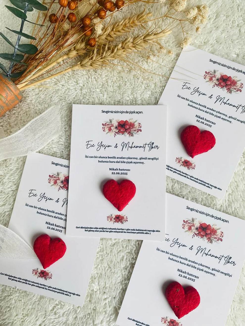 Geri dönüştürülmüş kağıda yerleştirilen kalp/yaprak formundaki tohum bombası ile hazırlanır. İsim–tarih baskılıdır ve misafirleriniz karttaki tohumu 1 gün suda bekletip toprağa hafifçe gömerek, düzenli nem verip gün ışığında filizlendirebilir. Hem hatıra hem de doğaya minik bir armağan!