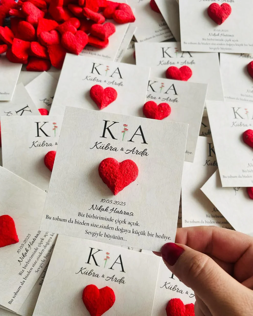 Aşkınız çiçek açsın! Geri dönüştürülmüş kağıtlarla kalp ve çiçek formunda tohum bombası ile hazırlanan bu kartlar, isim–tarih baskılı ve tamamen size özel üretilir. Davetinizden sonra misafirleriniz tohumu 1 gün suda bekletip toprağa ektiklerinde çiçekler açar.