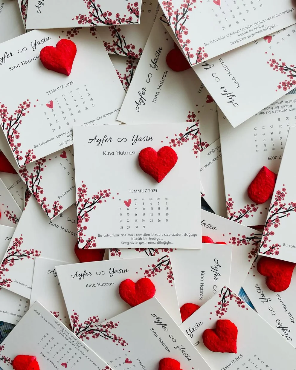 Aşkınız çiçek açsın! Geri dönüştürülmüş kağıtlarla kalp ve çiçek formunda tohum bombası ile hazırlanan bu kartlar, isim–tarih baskılı ve tamamen size özel üretilir. Davetinizden sonra misafirleriniz tohumu 1 gün suda bekletip toprağa ektiklerinde çiçekler açar.