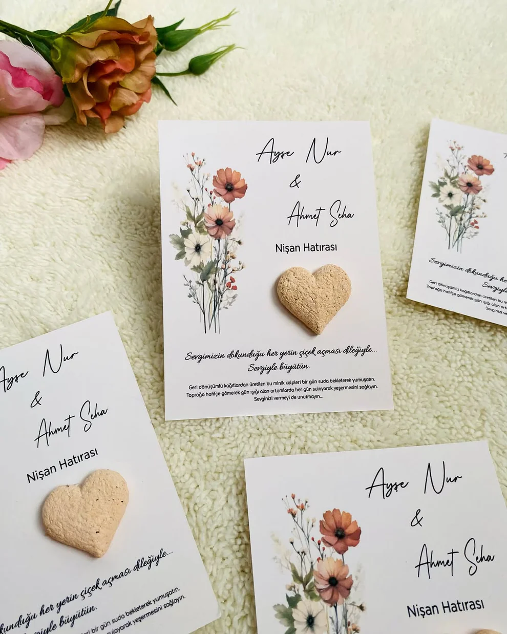 Geri dönüştürülmüş kağıda yerleştirilen kalp/yaprak formundaki tohum bombası ile hazırlanır. İsim–tarih baskılıdır ve misafirleriniz karttaki tohumu 1 gün suda bekletip toprağa hafifçe gömerek, düzenli nem verip gün ışığında filizlendirebilir. Hem hatıra hem de doğaya minik bir armağan!