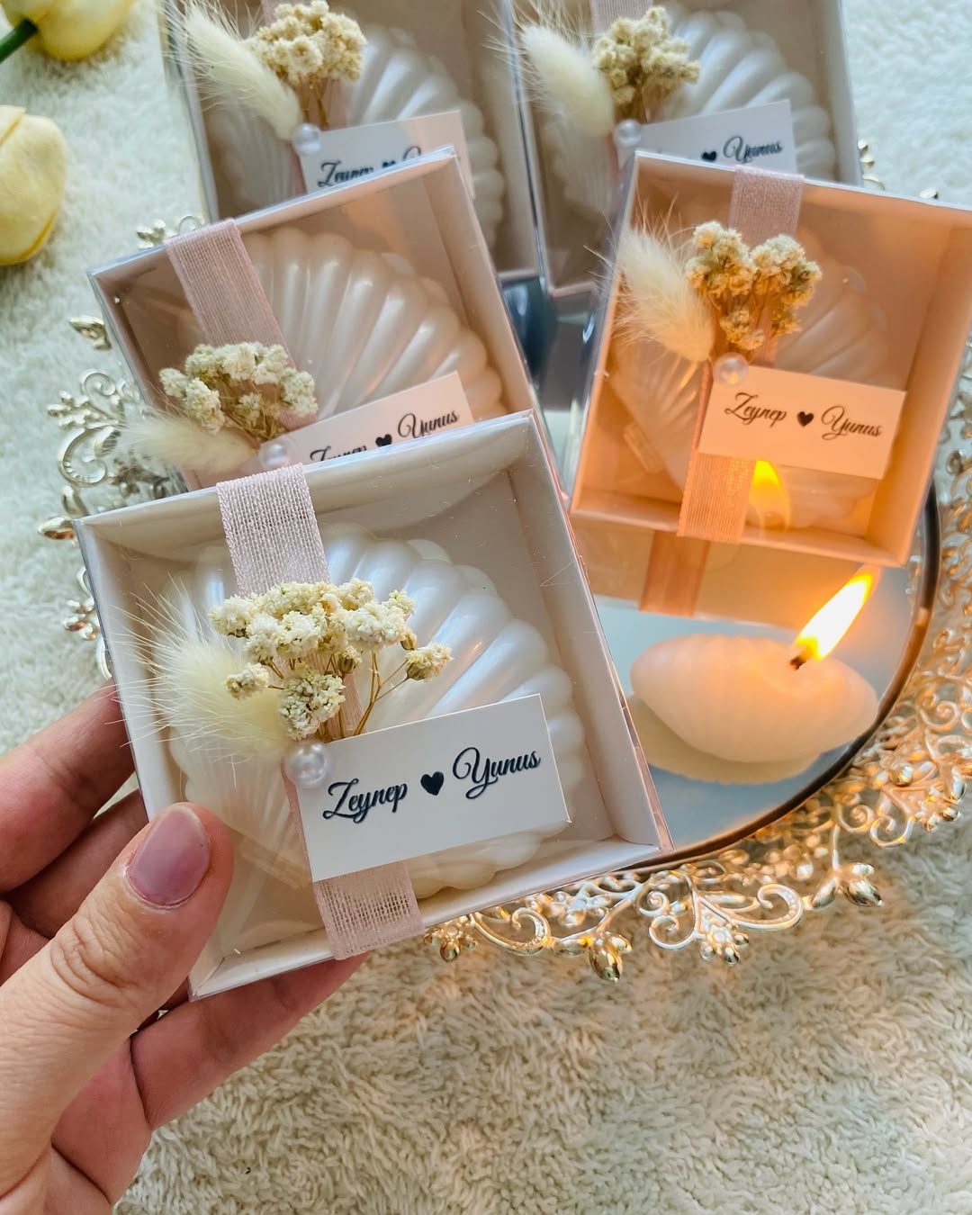 Davetlerinize sıcak bir dokunuş katın! Özenle hazırlanan My Design kutulu mumlar, isim–tarih baskılı etiketleri, kurdele ve kuru çiçek detaylarıyla kişiye özel hale gelir. Her model şeffaf kutusunda sunulur.