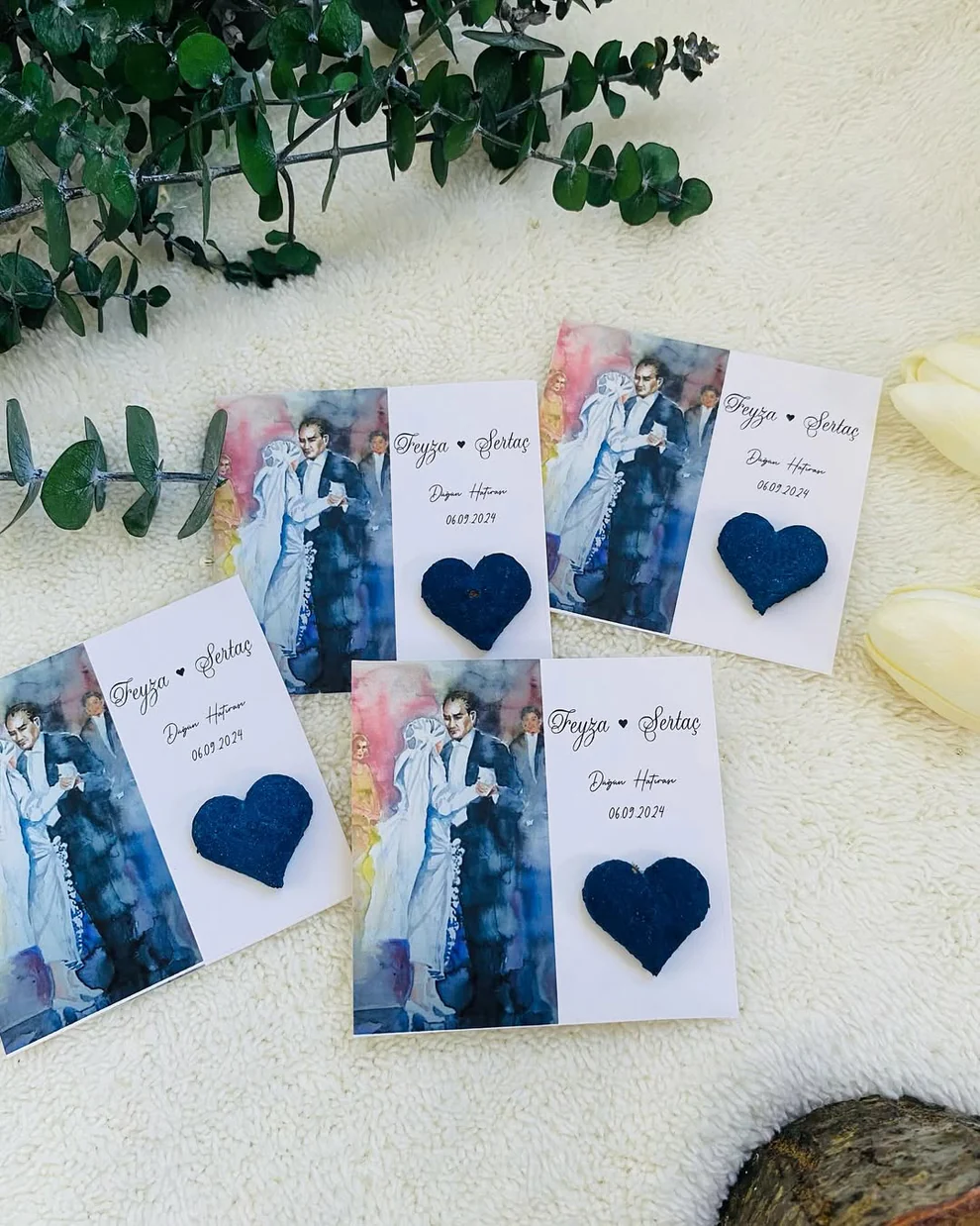 Aşkınız çiçek açsın! Geri dönüştürülmüş kağıtlarla kalp ve çiçek formunda tohum bombası ile hazırlanan bu kartlar, isim–tarih baskılı ve tamamen size özel üretilir. Davetinizden sonra misafirleriniz tohumu 1 gün suda bekletip toprağa ektiklerinde çiçekler açar.