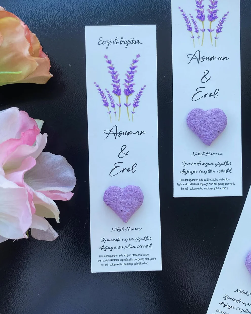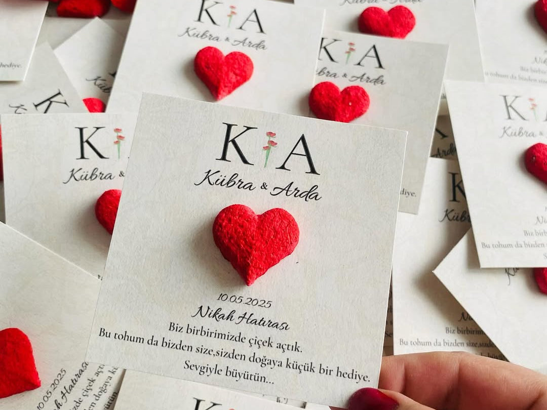 Sevginiz çiçek açsın! Geri dönüştürülmüş kağıtla hazırlanmış kalp ve çiçek formlu tohum bombası kartları, isim–tarih kişiselleştirmesiyle davetlerinize hem anlam hem doğallık katar. Misafirleriniz karttaki tohumu eve götürüp toprağa ekerek bu özel günü yıllarca hatırlar.