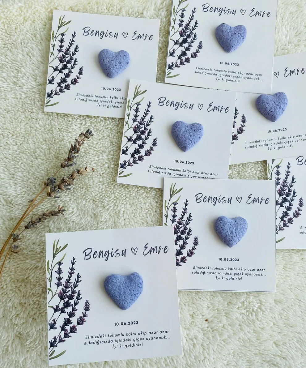 Aşkınız çiçek açsın! Geri dönüştürülmüş kağıtlarla kalp ve çiçek formunda tohum bombası ile hazırlanan bu kartlar, isim–tarih baskılı ve tamamen size özel üretilir. Davetinizden sonra misafirleriniz tohumu 1 gün suda bekletip toprağa ektiklerinde çiçekler açar.