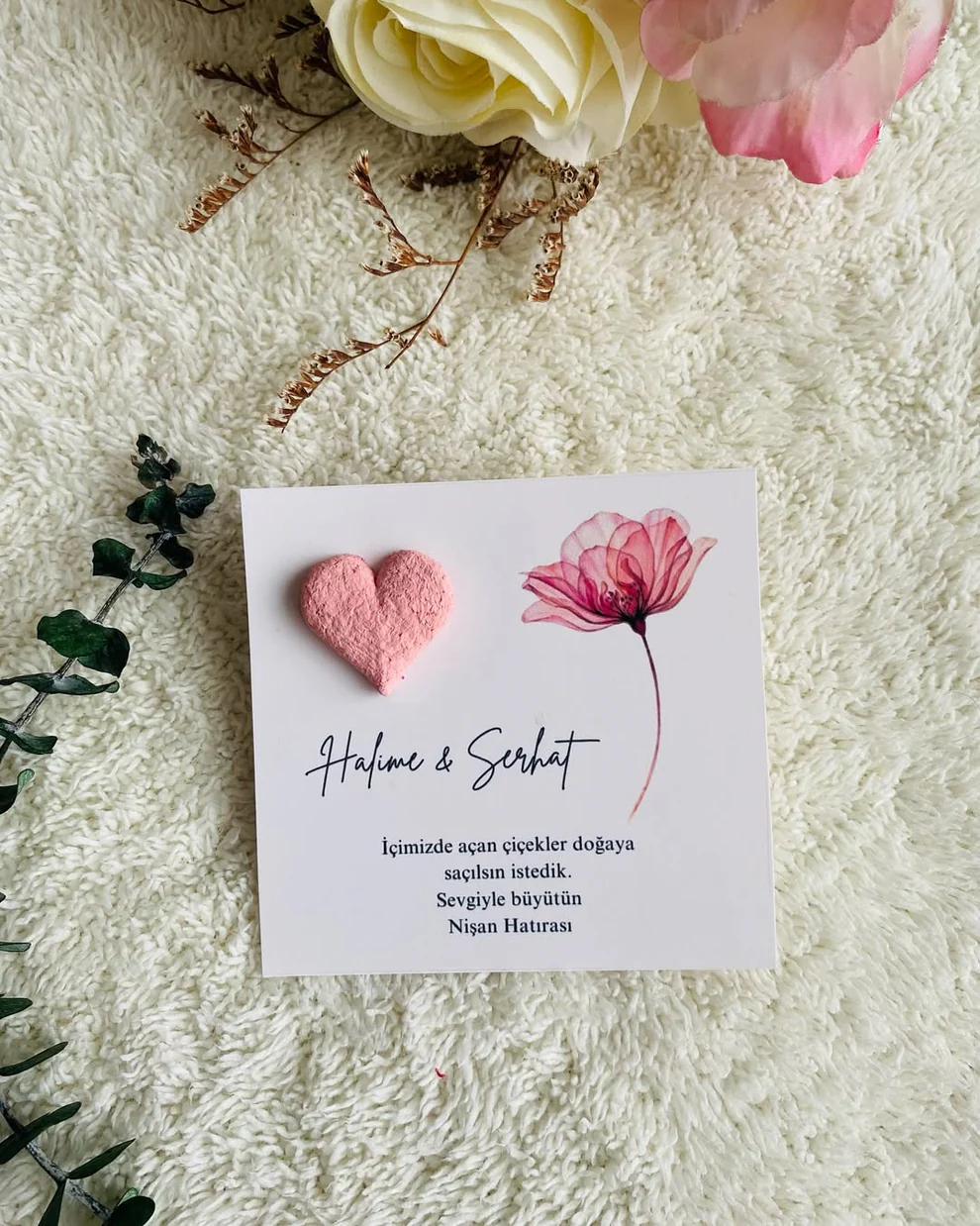 Aşkınız çiçek açsın! Geri dönüştürülmüş kağıtlarla kalp ve çiçek formunda tohum bombası ile hazırlanan bu kartlar, isim–tarih baskılı ve tamamen size özel üretilir. Davetinizden sonra misafirleriniz tohumu 1 gün suda bekletip toprağa ektiklerinde çiçekler açar.