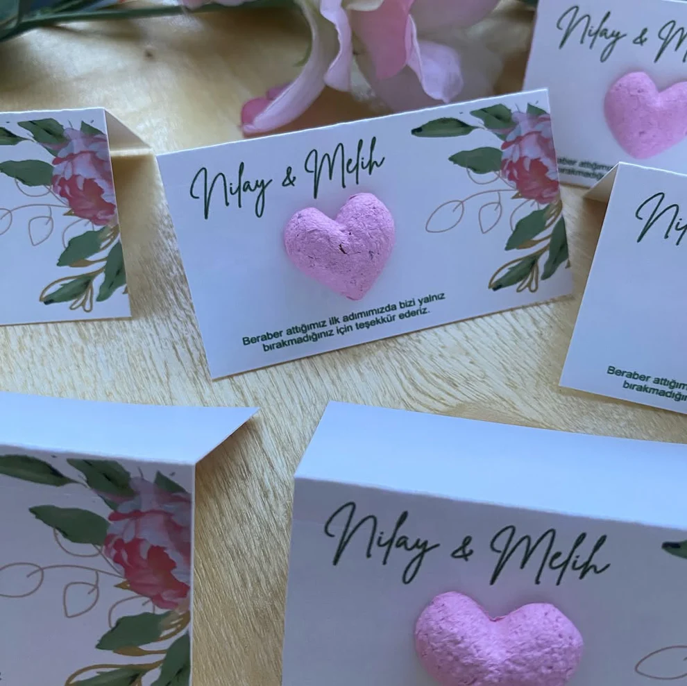Geri dönüştürülmüş kağıda yerleştirilen kalp/yaprak formundaki tohum bombası ile hazırlanır. İsim–tarih baskılıdır ve misafirleriniz karttaki tohumu 1 gün suda bekletip toprağa hafifçe gömerek, düzenli nem verip gün ışığında filizlendirebilir. Hem hatıra hem de doğaya minik bir armağan!