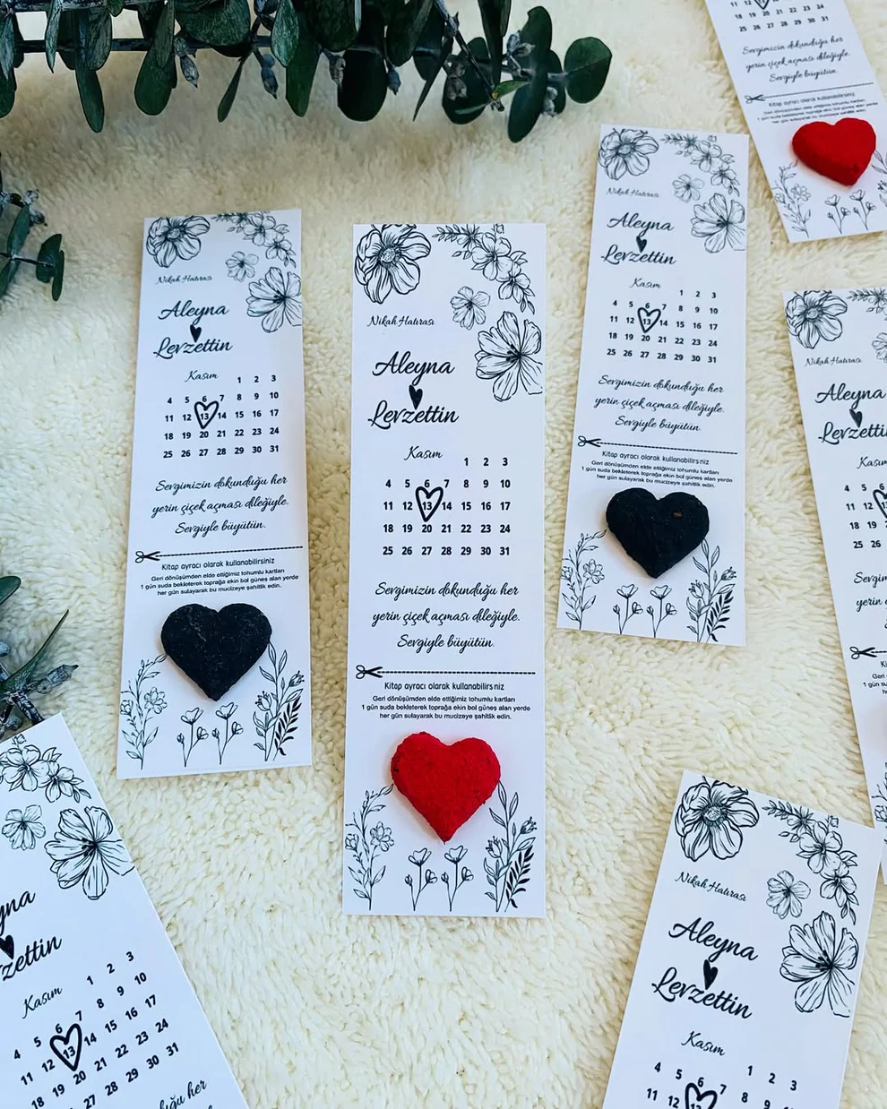 Sevginiz çiçek açsın! Geri dönüştürülmüş kağıtla hazırlanmış kalp ve çiçek formlu tohum bombası kartları, isim–tarih kişiselleştirmesiyle davetlerinize hem anlam hem doğallık katar. Misafirleriniz karttaki tohumu eve götürüp toprağa ekerek bu özel günü yıllarca hatırlar.