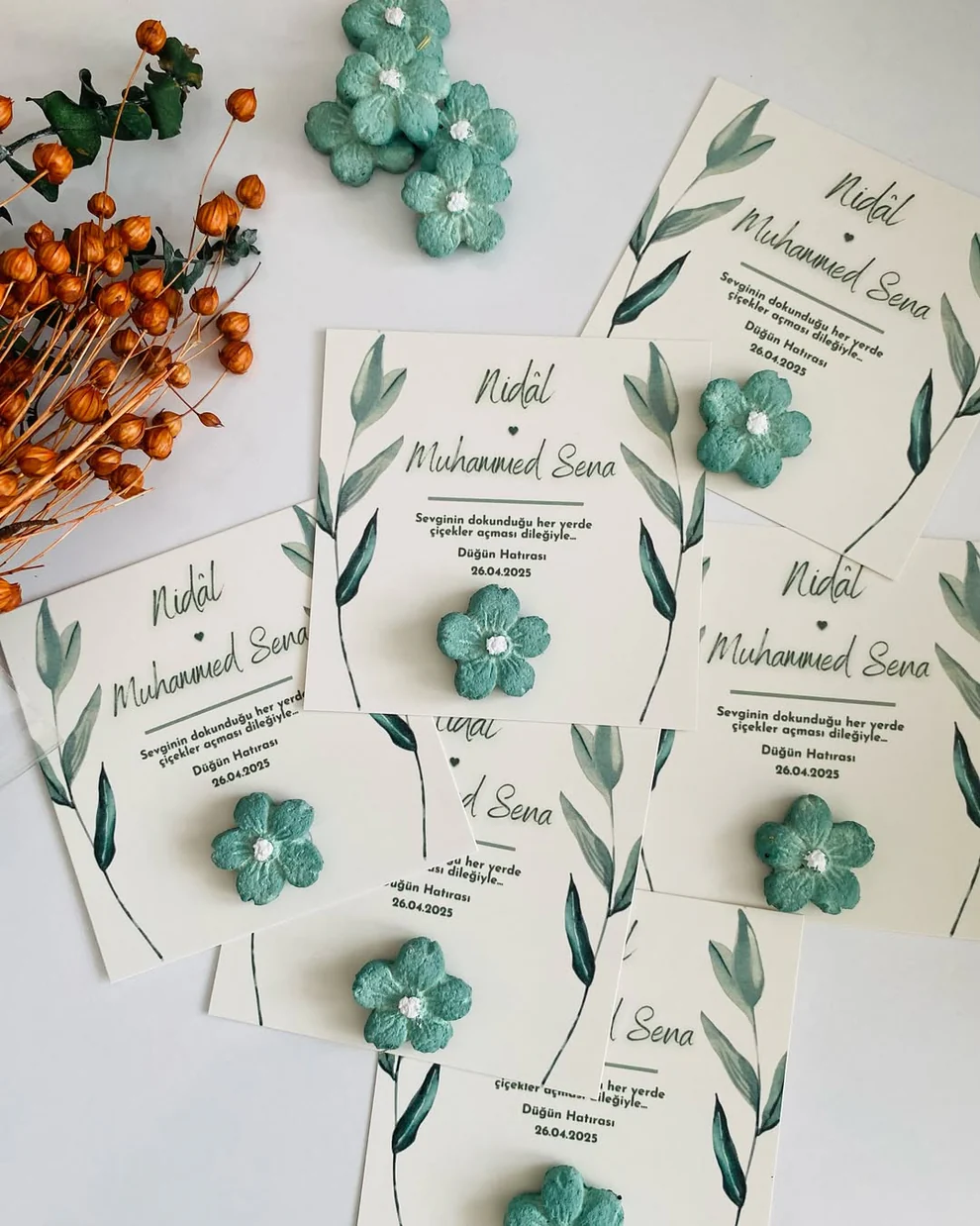 Aşkınız çiçek açsın! Geri dönüştürülmüş kağıtlarla kalp ve çiçek formunda tohum bombası ile hazırlanan bu kartlar, isim–tarih baskılı ve tamamen size özel üretilir. Davetinizden sonra misafirleriniz tohumu 1 gün suda bekletip toprağa ektiklerinde çiçekler açar.