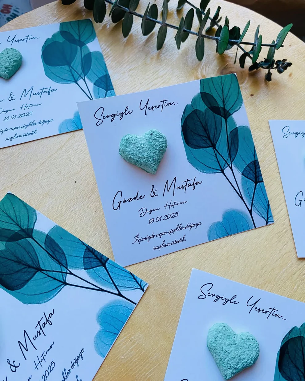 Aşkınız çiçek açsın! Geri dönüştürülmüş kağıtlarla kalp ve çiçek formunda tohum bombası ile hazırlanan bu kartlar, isim–tarih baskılı ve tamamen size özel üretilir. Davetinizden sonra misafirleriniz tohumu 1 gün suda bekletip toprağa ektiklerinde çiçekler açar.