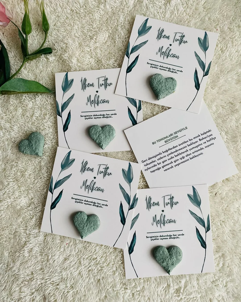 Aşkınız çiçek açsın! Geri dönüştürülmüş kağıtlarla kalp ve çiçek formunda tohum bombası ile hazırlanan bu kartlar, isim–tarih baskılı ve tamamen size özel üretilir. Davetinizden sonra misafirleriniz tohumu 1 gün suda bekletip toprağa ektiklerinde çiçekler açar.