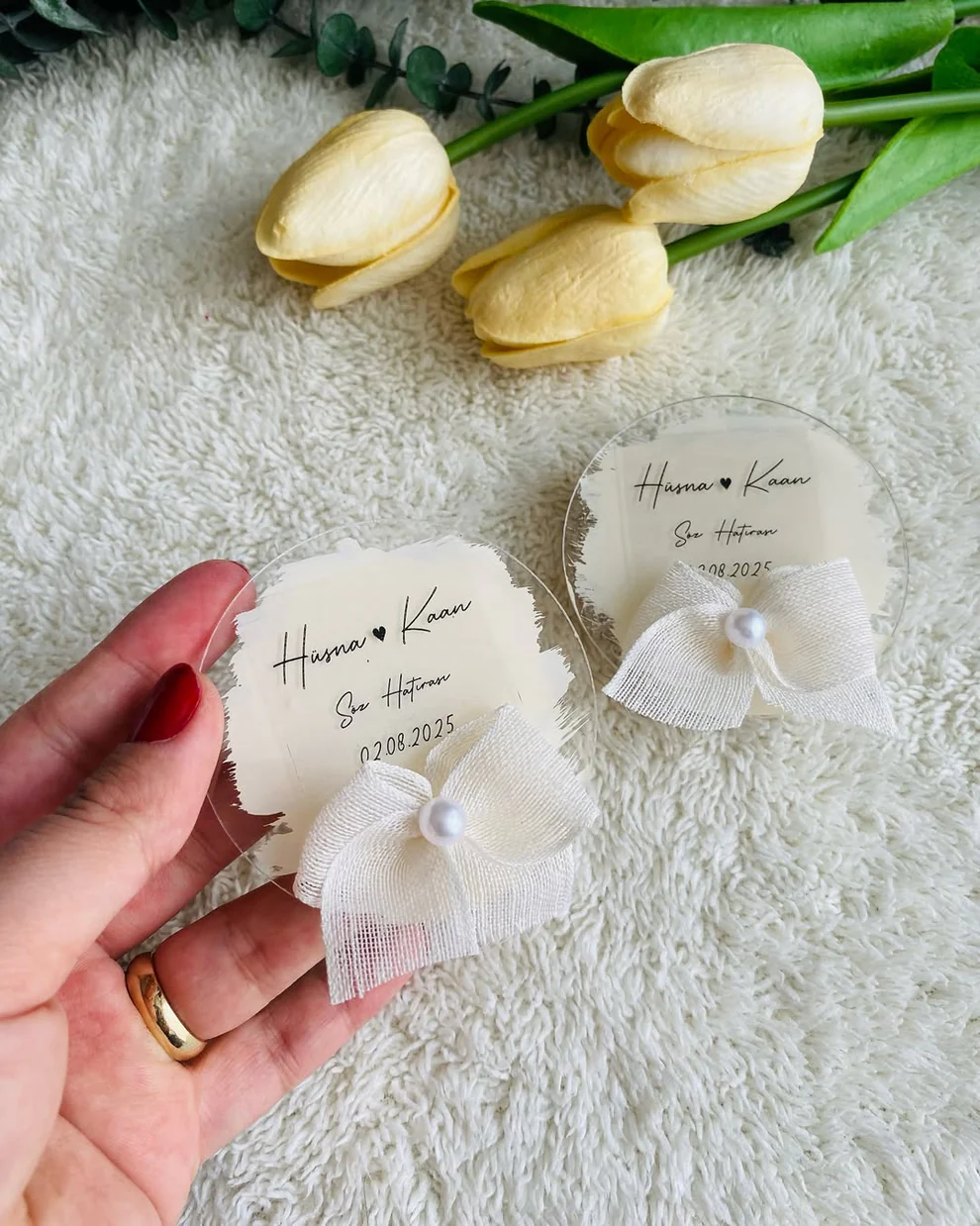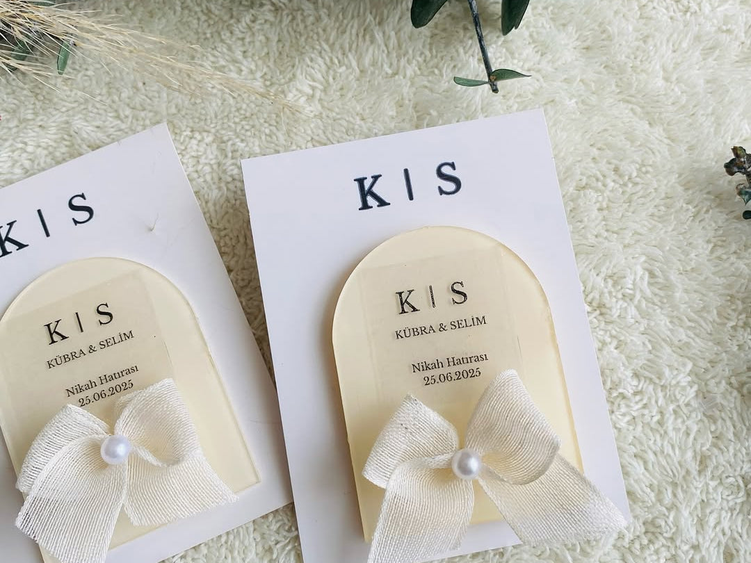 Işıltısını zarafetten alan My Design pleksi magnet modelleri isim–tarih baskılı kişiselleştirme ve güçlü mıknatıs ile davetinizin en şık hatırası oluyor. Şeffaf / oval formlar, krem tonlarında kurdele ve inci dokunuşlarıyla modern ve minimal bir görünüm sunar. Tüm modeller buzdolabı dahil metal yüzeylere sağlamca tutunur.