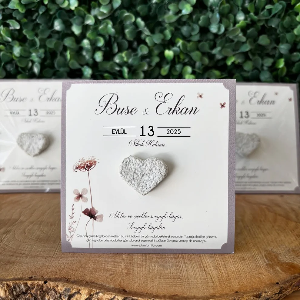 Yeşeren tohum bombalı nikah kartları ile sevdiklerinize unutulmaz bir hatıra bırakın. Geri dönüştürülmüş kağıttan üretilen tohum bombaları kalp, çiçek veya yaprak figürleri ile hazırlanarak seçtiğiniz modelde üretilir. Tohum bombası kullanımı: 1 gün suda bekletin, toprağa gömün, nemli tutun; kısa sürede filizlenen çiçek tohumlarıyla anlamlı bir hatıraya dönüştürün. Kartlar üzerinde isim ve tarih kişiselleştirmesi yapılır.
