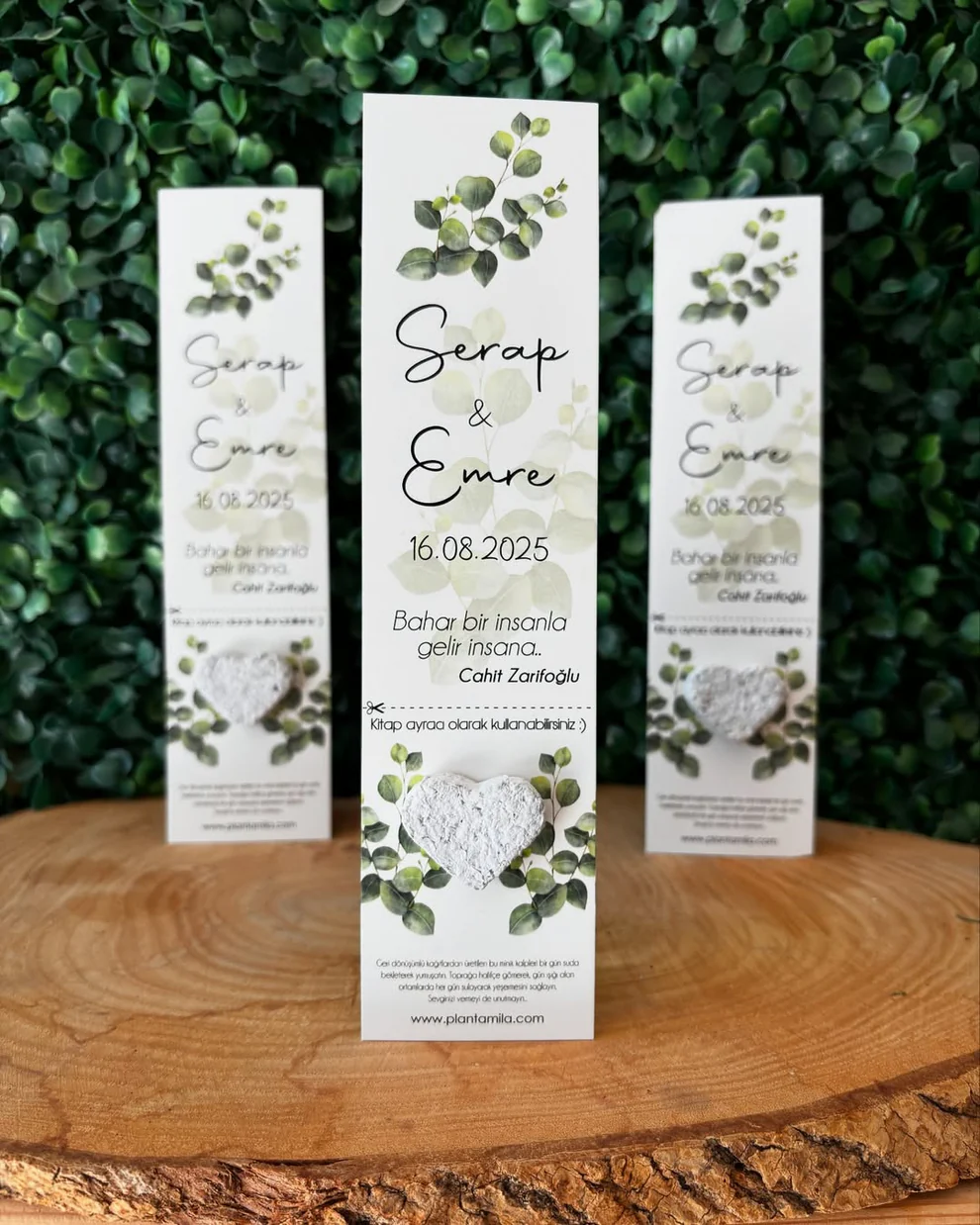 Kitap ayracı mı, yeşeren bir anı mı? İkisi bir arada. Geri dönüşümlü kağıda yerleştirilen kalp/yaprak formunda tohum bombası bir gün suda yumuşatılıp toprağa bırakıldığında filizlenir. Misafirleriniz okudukça sizi hatırlar, ektikçe hatıranız büyür.