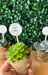 Doğal görünümlü mini sukulentler, jüt kumaşla sarılı mini saksısında ve çubuklu kişisel kart ile sunulur. Kartlara isim–tarih eklenir; rustik ip bağlama sayesinde her konseptle uyum sağlar.