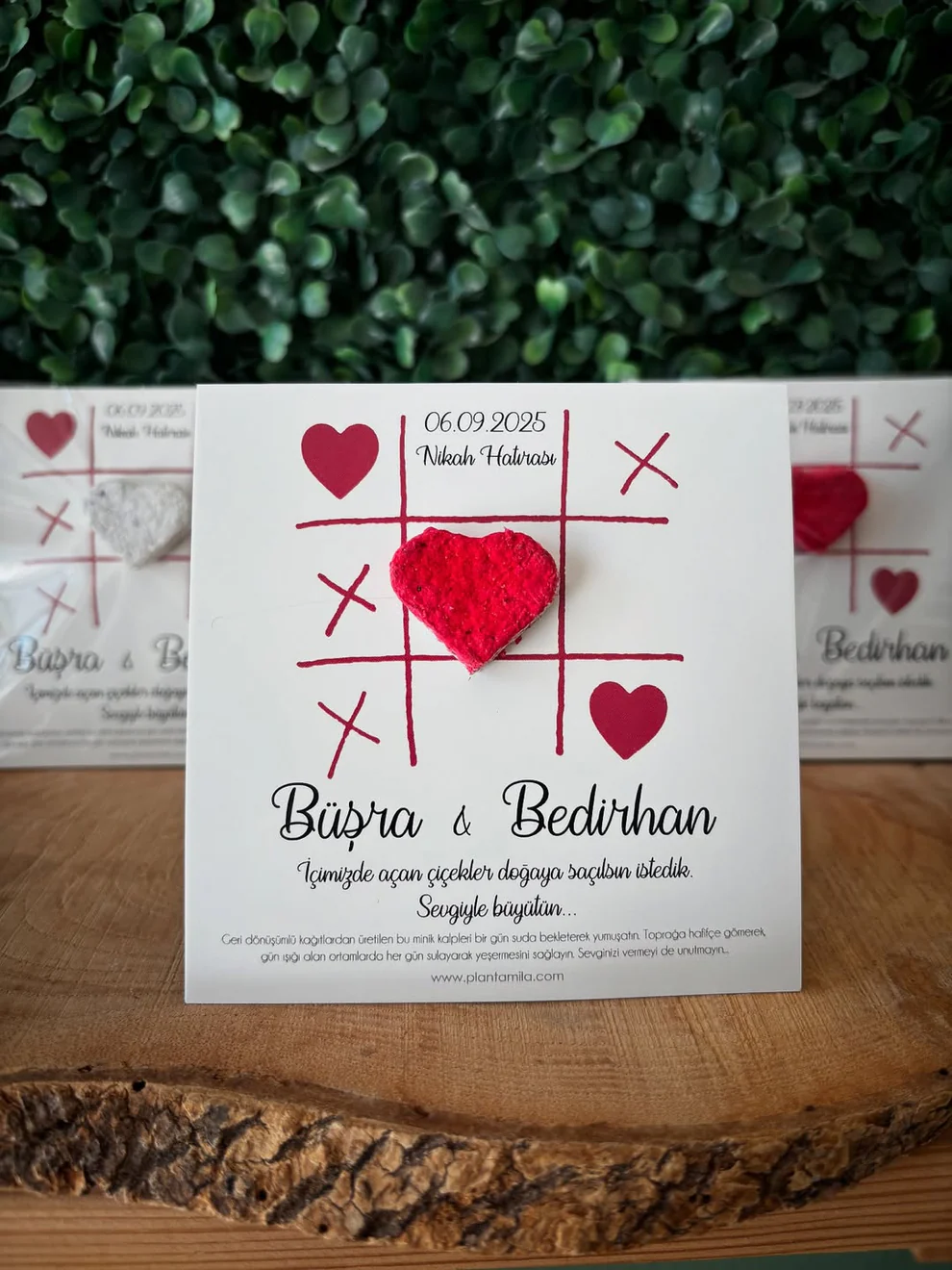 Yeşeren tohum bombalı nikah kartları ile sevdiklerinize unutulmaz bir hatıra bırakın. Geri dönüştürülmüş kağıttan üretilen tohum bombaları kalp, çiçek veya yaprak figürleri ile hazırlanarak seçtiğiniz modelde üretilir. Tohum bombası kullanımı: 1 gün suda bekletin, toprağa gömün, nemli tutun; kısa sürede filizlenen çiçek tohumlarıyla anlamlı bir hatıraya dönüştürün. Kartlar üzerinde isim ve tarih kişiselleştirmesi yapılır.
