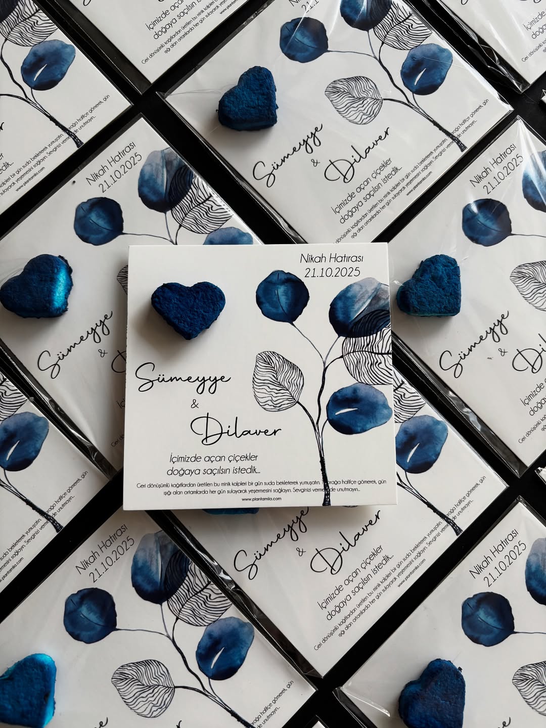 Yeşeren tohum bombalı nikah kartları ile sevdiklerinize unutulmaz bir hatıra bırakın. Geri dönüştürülmüş kağıttan üretilen tohum bombaları kalp, çiçek veya yaprak figürleri ile hazırlanarak seçtiğiniz modelde üretilir. Tohum bombası kullanımı: 1 gün suda bekletin, toprağa gömün, nemli tutun; kısa sürede filizlenen çiçek tohumlarıyla anlamlı bir hatıraya dönüştürün. Kartlar üzerinde isim ve tarih kişiselleştirmesi yapılır.