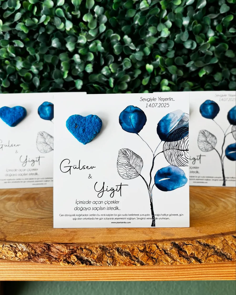 Yeşeren tohum bombalı nikah kartları ile sevdiklerinize unutulmaz bir hatıra bırakın. Geri dönüştürülmüş kağıttan üretilen tohum bombaları kalp, çiçek veya yaprak figürleri ile hazırlanarak seçtiğiniz modelde üretilir. Tohum bombası kullanımı: 1 gün suda bekletin, toprağa gömün, nemli tutun; kısa sürede filizlenen çiçek tohumlarıyla anlamlı bir hatıraya dönüştürün. Kartlar üzerinde isim ve tarih kişiselleştirmesi yapılır.