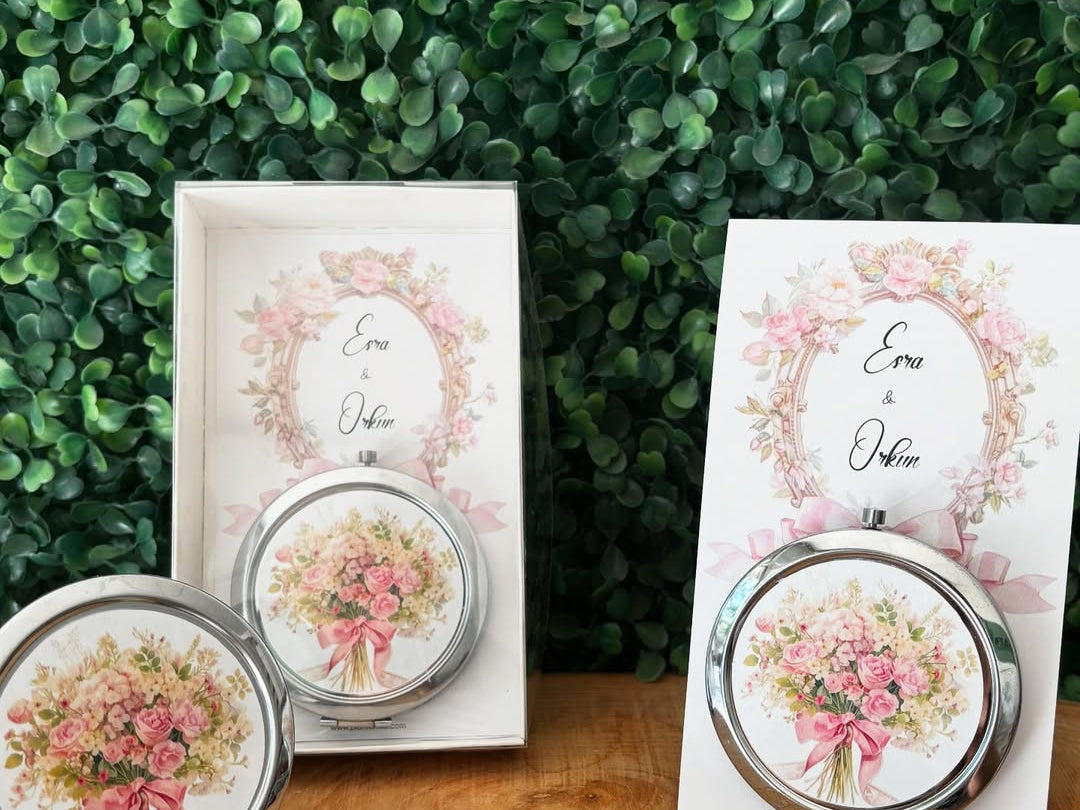 Özel günleriniz için hem şık hem kullanışlı bir hatıra: Plantamila üretimi, yuvarlak metal kompakt el aynaları. Parlak krom gövde, çiçek illüstrasyonlu ön yüz ve kişiye özel kart ile konseptinize kolayca uyum sağlar.
