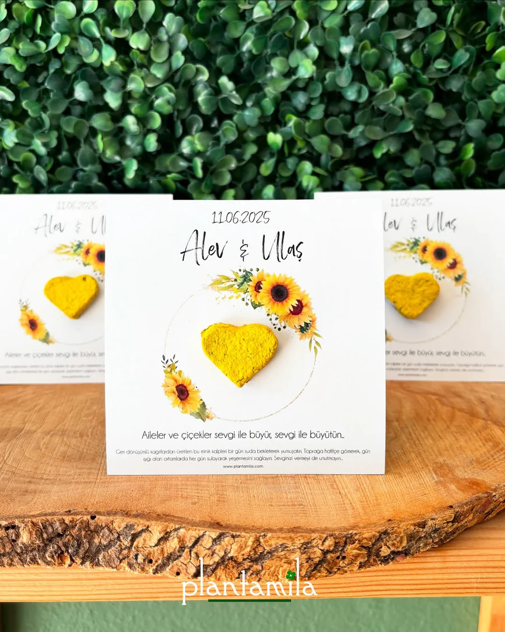 Yeşeren tohum bombalı nikah kartları ile sevdiklerinize unutulmaz bir hatıra bırakın. Geri dönüştürülmüş kağıttan üretilen tohum bombaları kalp, çiçek veya yaprak figürleri ile hazırlanarak seçtiğiniz modelde üretilir. Tohum bombası kullanımı: 1 gün suda bekletin, toprağa gömün, nemli tutun; kısa sürede filizlenen çiçek tohumlarıyla anlamlı bir hatıraya dönüştürün. Kartlar üzerinde isim ve tarih kişiselleştirmesi yapılır.