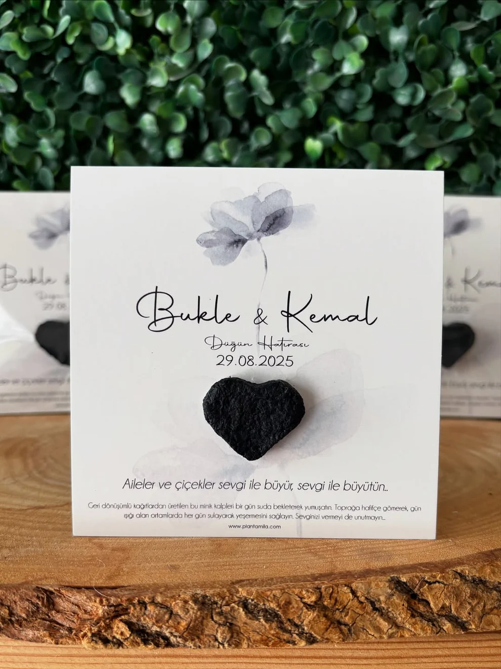 Yeşeren tohum bombalı nikah kartları ile sevdiklerinize unutulmaz bir hatıra bırakın. Geri dönüştürülmüş kağıttan üretilen tohum bombaları kalp, çiçek veya yaprak figürleri ile hazırlanarak seçtiğiniz modelde üretilir. Tohum bombası kullanımı: 1 gün suda bekletin, toprağa gömün, nemli tutun; kısa sürede filizlenen çiçek tohumlarıyla anlamlı bir hatıraya dönüştürün. Kartlar üzerinde isim ve tarih kişiselleştirmesi yapılır.