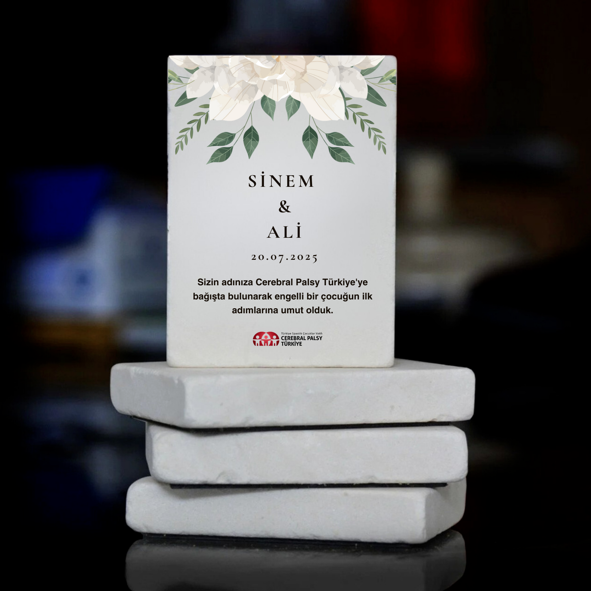 Özel gününüzde hem anlamlı hem de kalıcı bir hatıra istiyorsanız doğal taş üzerine özel baskı ile hazırlanan magnet modelleri tam size göre. Türkiye Spastik Çocuklar Vakfı magnet modellerini isim–tarih ve metinle tamamen size özel tasarlıyor. Magnetler arkasında güçlü mıknatıs bulunuyor. Buzdolabı ya da panolarda yıllarca ilk günkü gibi sergilenebiliyor.