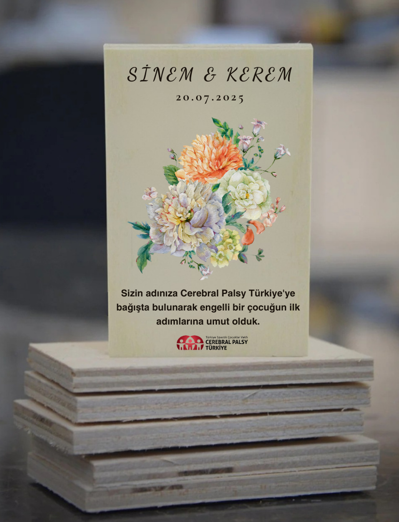 Türkiye Spastik Çocuklar Vakfı (Cerebral Palsy Türkiye) tarafından üretilen magnetler, doğal ahşap yüzeye isim–tarih ve seçtiğiniz desende yüksek kaliteli baskıyla işlenir. Arkasındaki güçlü mıknatıs metal yüzeylere sağlam tutunur. Her parça kişiye özel hazırlanır ve şık bir anı olarak yıllarca saklanır.