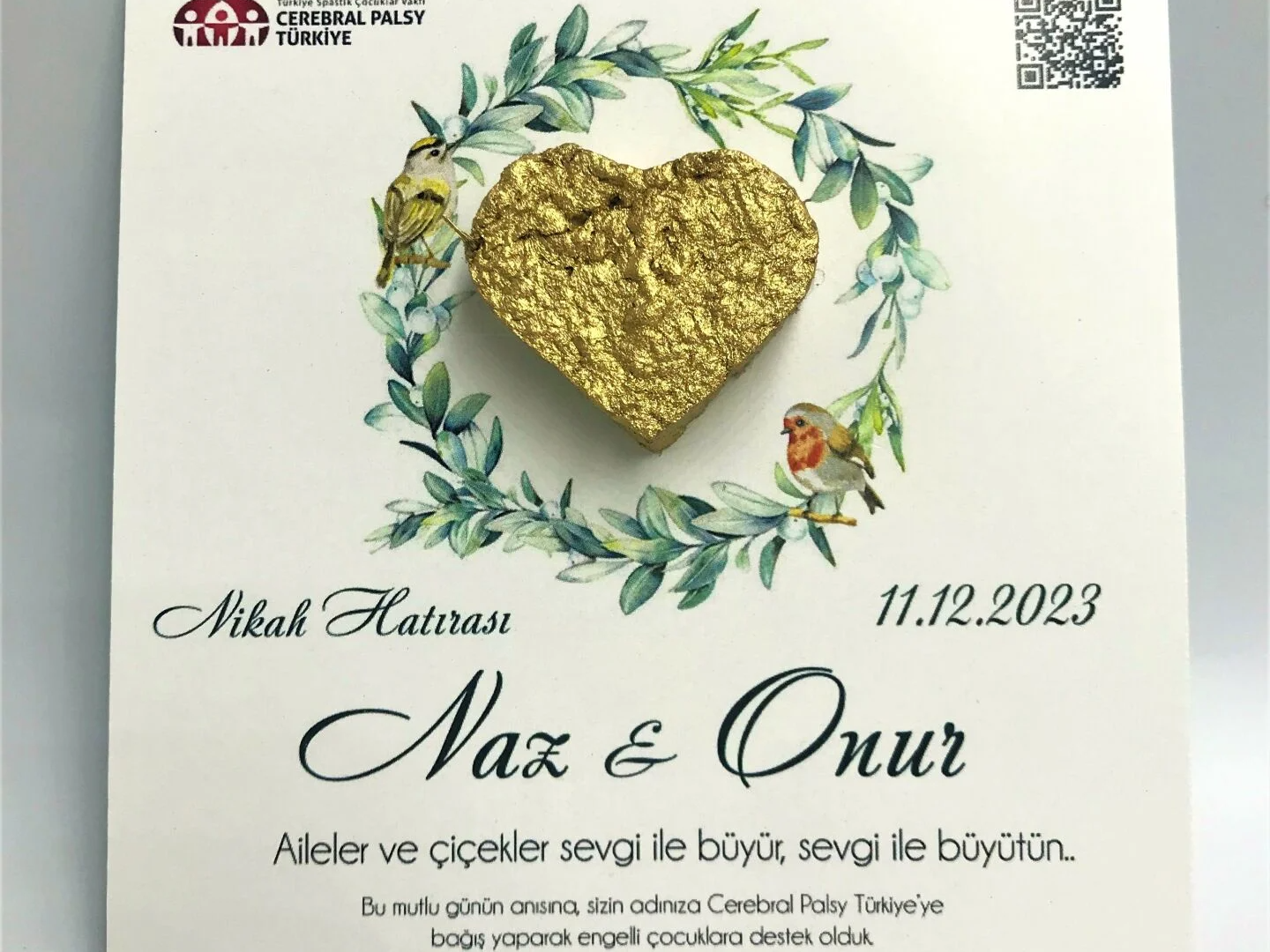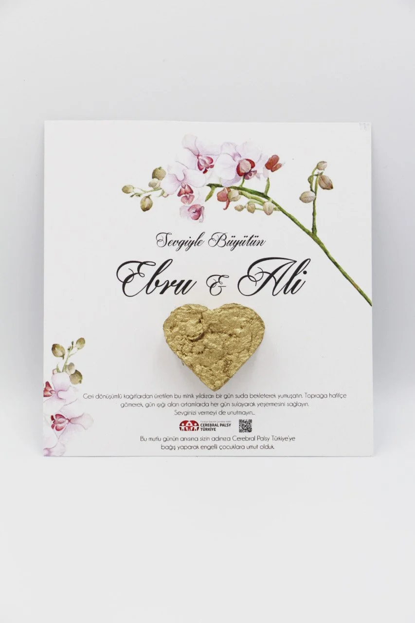 İsim–tarih baskılı kartıyla kişiye özel hazırlanır, vakıf logosu ve bağış mesajı üzerinde yer alır. Nikah, söz ve nişanlar için hem anlamlı hem de sürdürülebilir bir hatıra arayanlar için idealdir. Her tohum kartı, Cerebral Palsy’li çocukların eğitim ve rehabilitasyon çalışmalarına destek olur.
