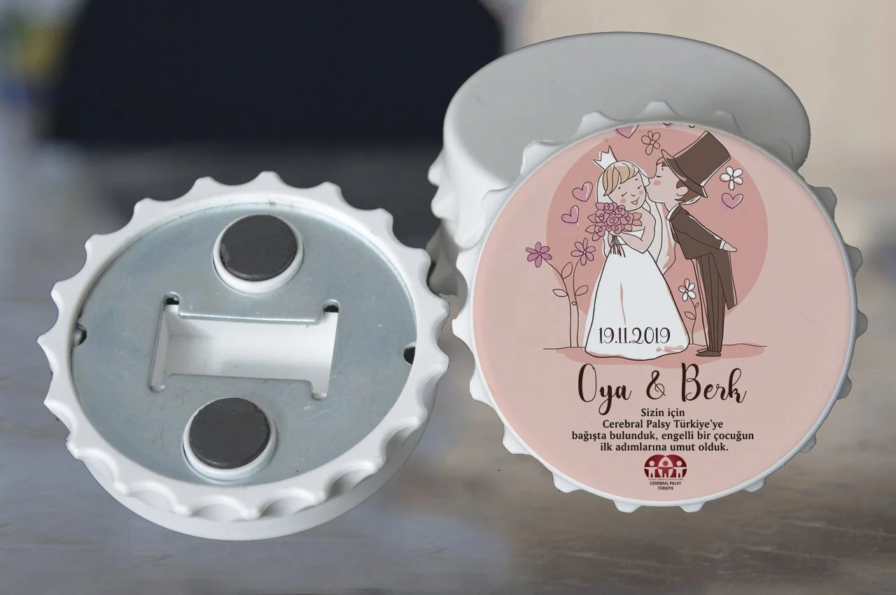 Türkiye Spastik Çocuklar Vakfı tarafından hazırlanan açacaklı nikah magnetleri, şık bir hatırayı anlamlı bir desteğe dönüştürüyor. Açacaklı nikah magnetleri güçlü mıknatıslı arka yüzeyi ile buzdolabına sağlam tutunur; entegre şişe açacağı ise günlük kullanıma pratiklik katar. İsim–tarih kişiselleştirmesi yapılır, Vakıf logosu ve “bağış” mesajı kart üzerinde yer alır.