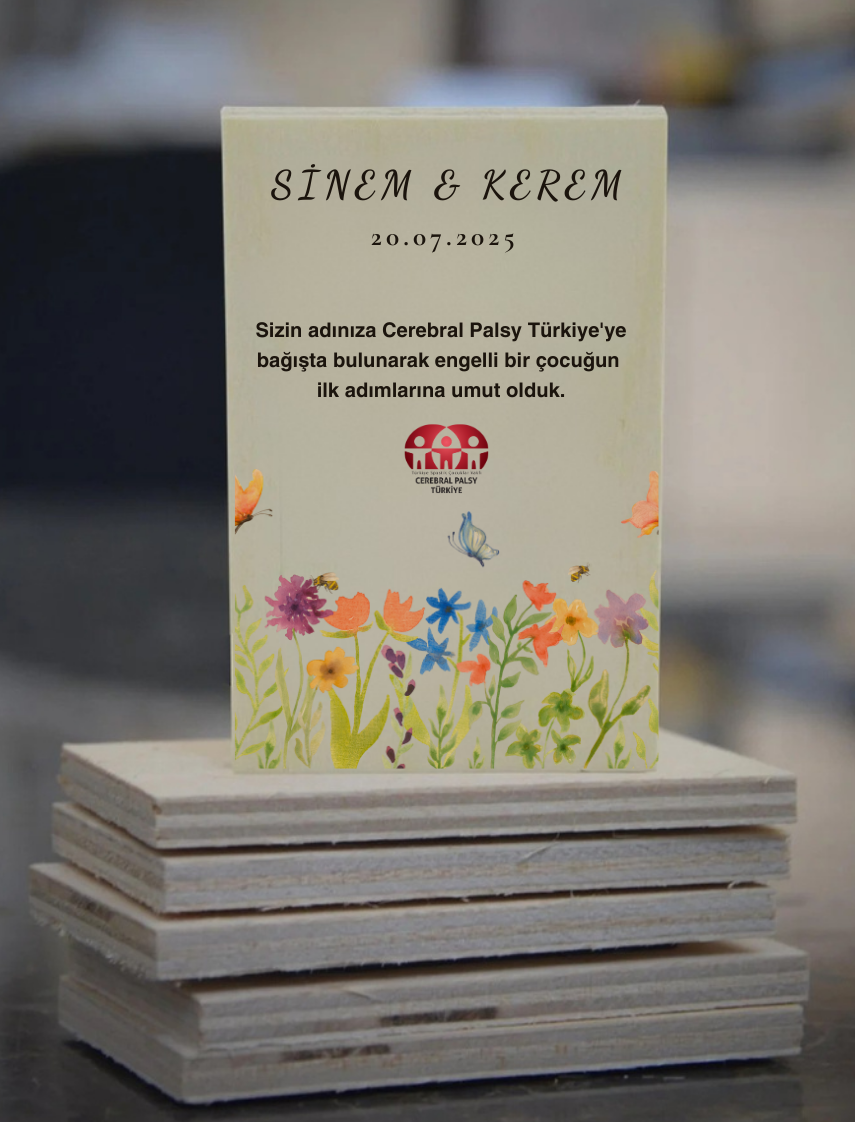 Türkiye Spastik Çocuklar Vakfı (Cerebral Palsy Türkiye) tarafından üretilen magnetler, doğal ahşap yüzeye isim–tarih ve seçtiğiniz desende yüksek kaliteli baskıyla işlenir. Arkasındaki güçlü mıknatıs metal yüzeylere sağlam tutunur. Her parça kişiye özel hazırlanır ve şık bir anı olarak yıllarca saklanır.