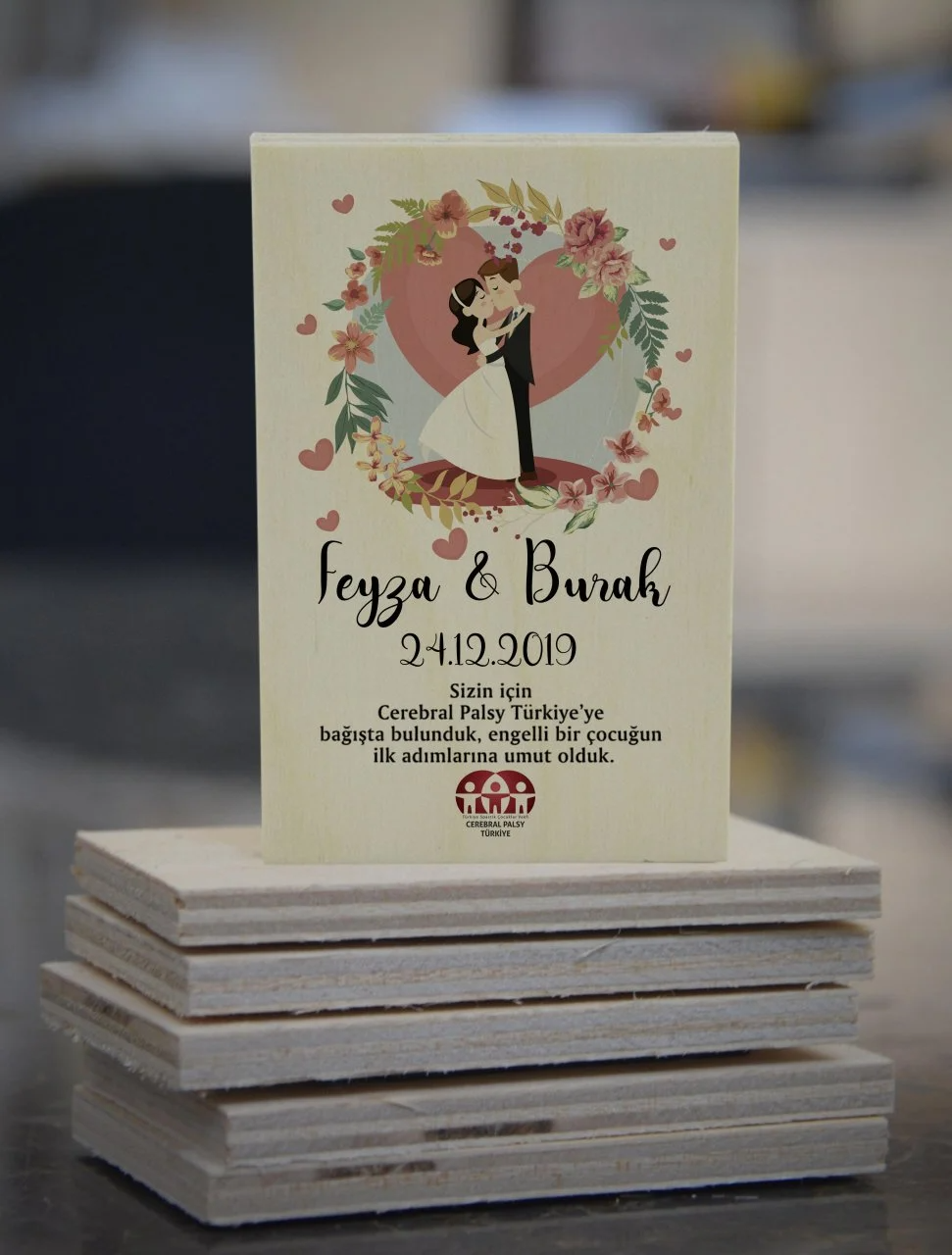 Türkiye Spastik Çocuklar Vakfı (Cerebral Palsy Türkiye) tarafından üretilen magnetler, doğal ahşap yüzeye isim–tarih ve seçtiğiniz desende yüksek kaliteli baskıyla işlenir. Arkasındaki güçlü mıknatıs metal yüzeylere sağlam tutunur. Her parça kişiye özel hazırlanır ve şık bir anı olarak yıllarca saklanır.