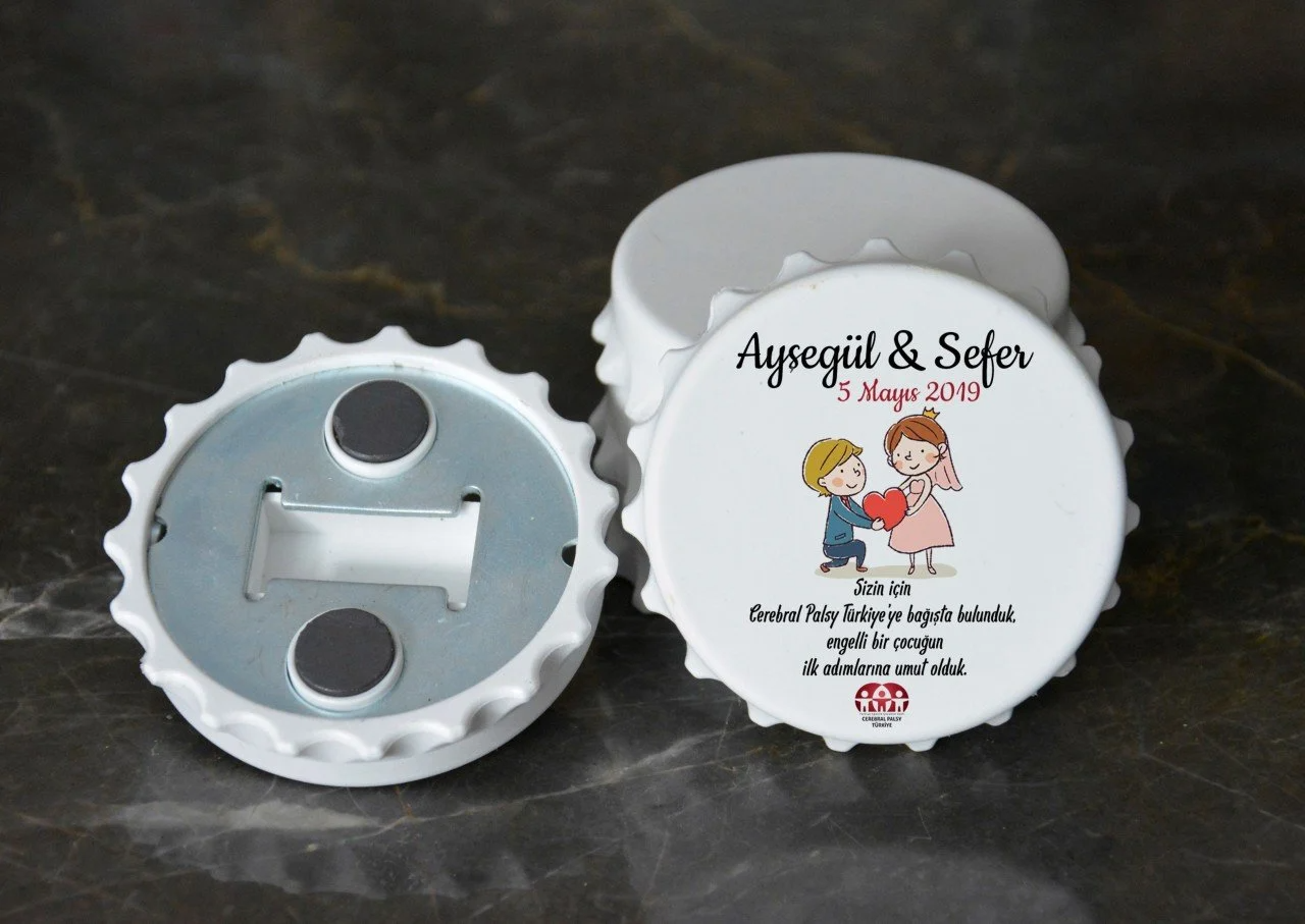 Türkiye Spastik Çocuklar Vakfı tarafından hazırlanan açacaklı nikah magnetleri, şık bir hatırayı anlamlı bir desteğe dönüştürüyor. Açacaklı nikah magnetleri güçlü mıknatıslı arka yüzeyi ile buzdolabına sağlam tutunur; entegre şişe açacağı ise günlük kullanıma pratiklik katar. İsim–tarih kişiselleştirmesi yapılır, Vakıf logosu ve “bağış” mesajı kart üzerinde yer alır.