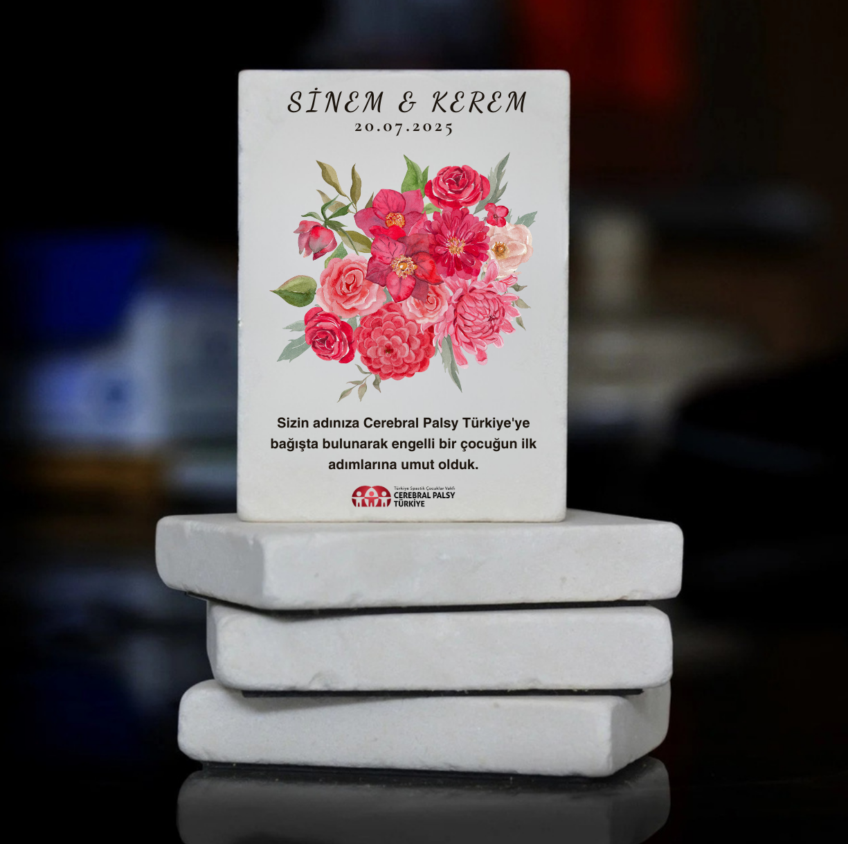 Özel gününüzde hem anlamlı hem de kalıcı bir hatıra istiyorsanız doğal taş üzerine özel baskı ile hazırlanan magnet modelleri tam size göre. Türkiye Spastik Çocuklar Vakfı magnet modellerini isim–tarih ve metinle tamamen size özel tasarlıyor. Magnetler arkasında güçlü mıknatıs bulunuyor. Buzdolabı ya da panolarda yıllarca ilk günkü gibi sergilenebiliyor.