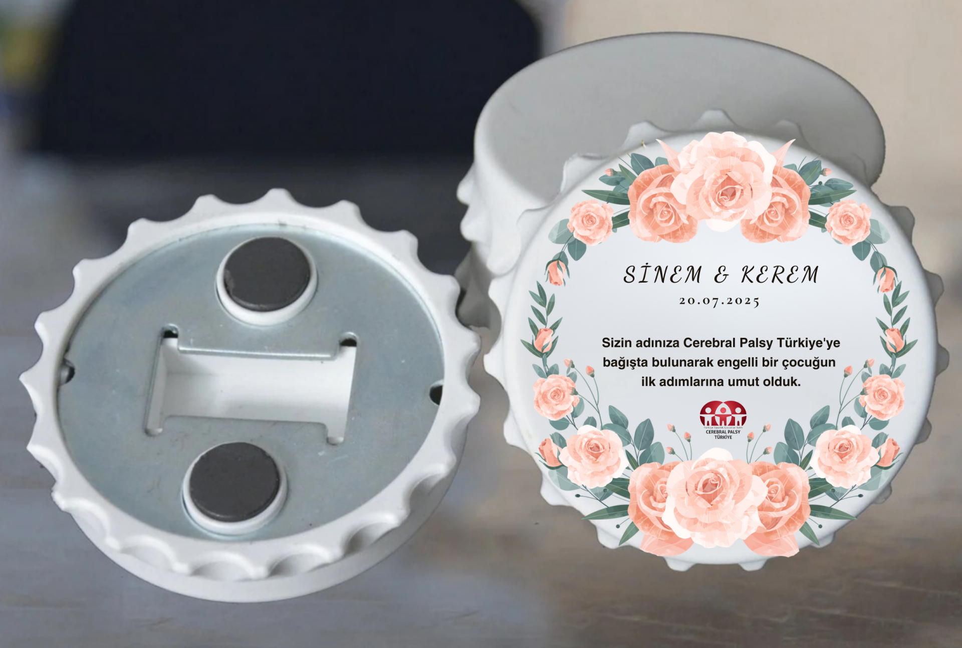 Türkiye Spastik Çocuklar Vakfı tarafından hazırlanan açacaklı nikah magnetleri, şık bir hatırayı anlamlı bir desteğe dönüştürüyor. Açacaklı nikah magnetleri güçlü mıknatıslı arka yüzeyi ile buzdolabına sağlam tutunur; entegre şişe açacağı ise günlük kullanıma pratiklik katar. İsim–tarih kişiselleştirmesi yapılır, Vakıf logosu ve “bağış” mesajı kart üzerinde yer alır.
