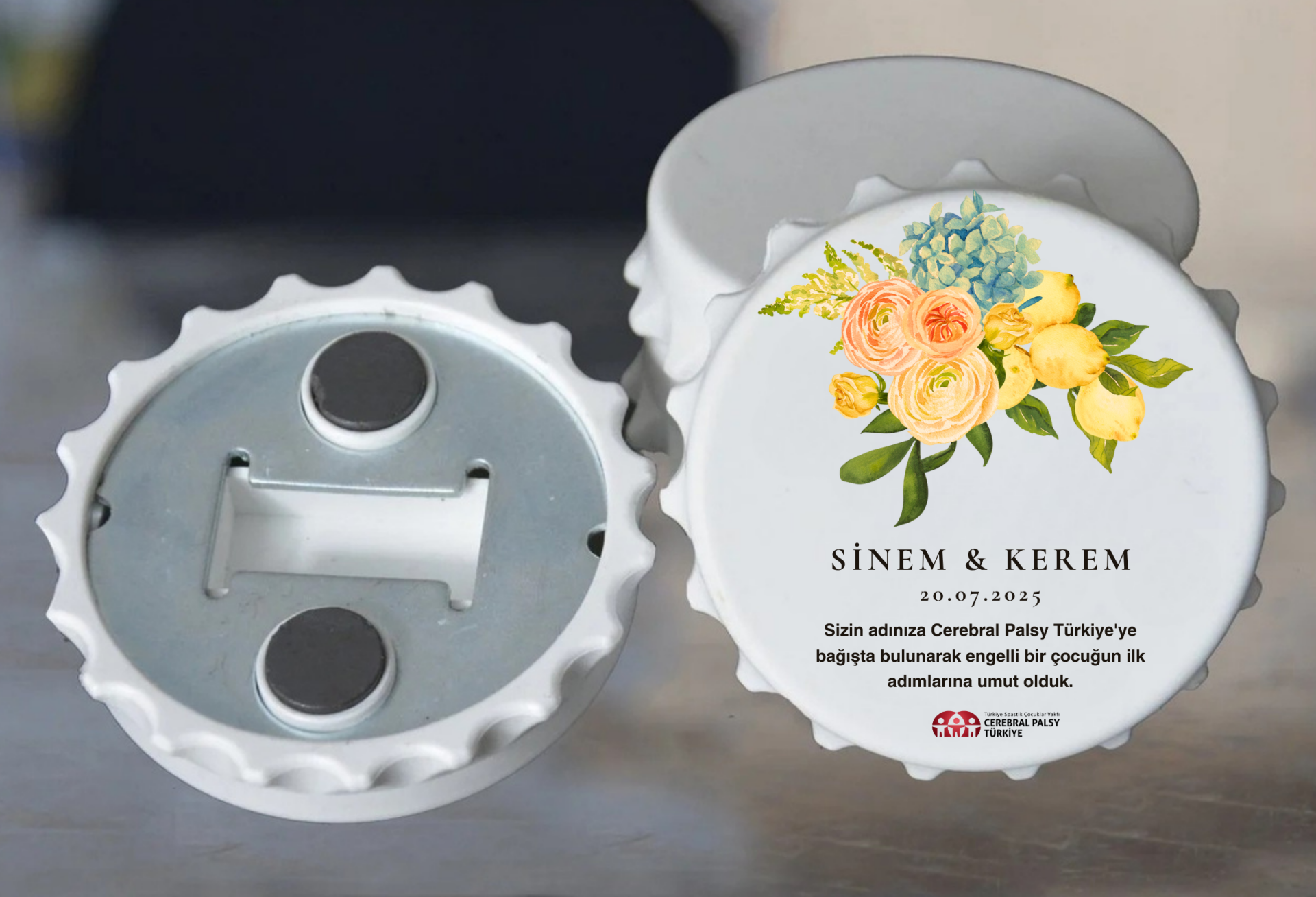 Türkiye Spastik Çocuklar Vakfı tarafından hazırlanan açacaklı nikah magnetleri, şık bir hatırayı anlamlı bir desteğe dönüştürüyor. Açacaklı nikah magnetleri güçlü mıknatıslı arka yüzeyi ile buzdolabına sağlam tutunur; entegre şişe açacağı ise günlük kullanıma pratiklik katar. İsim–tarih kişiselleştirmesi yapılır, Vakıf logosu ve “bağış” mesajı kart üzerinde yer alır.