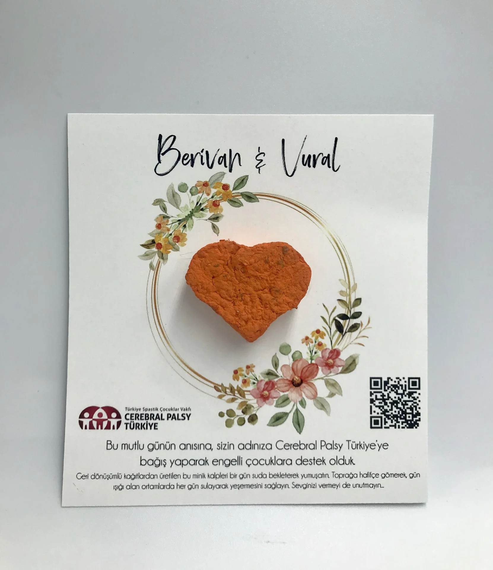 İsim–tarih baskılı kartıyla kişiye özel hazırlanır, vakıf logosu ve bağış mesajı üzerinde yer alır. Nikah, söz ve nişanlar için hem anlamlı hem de sürdürülebilir bir hatıra arayanlar için idealdir. Her tohum kartı, Cerebral Palsy’li çocukların eğitim ve rehabilitasyon çalışmalarına destek olur.