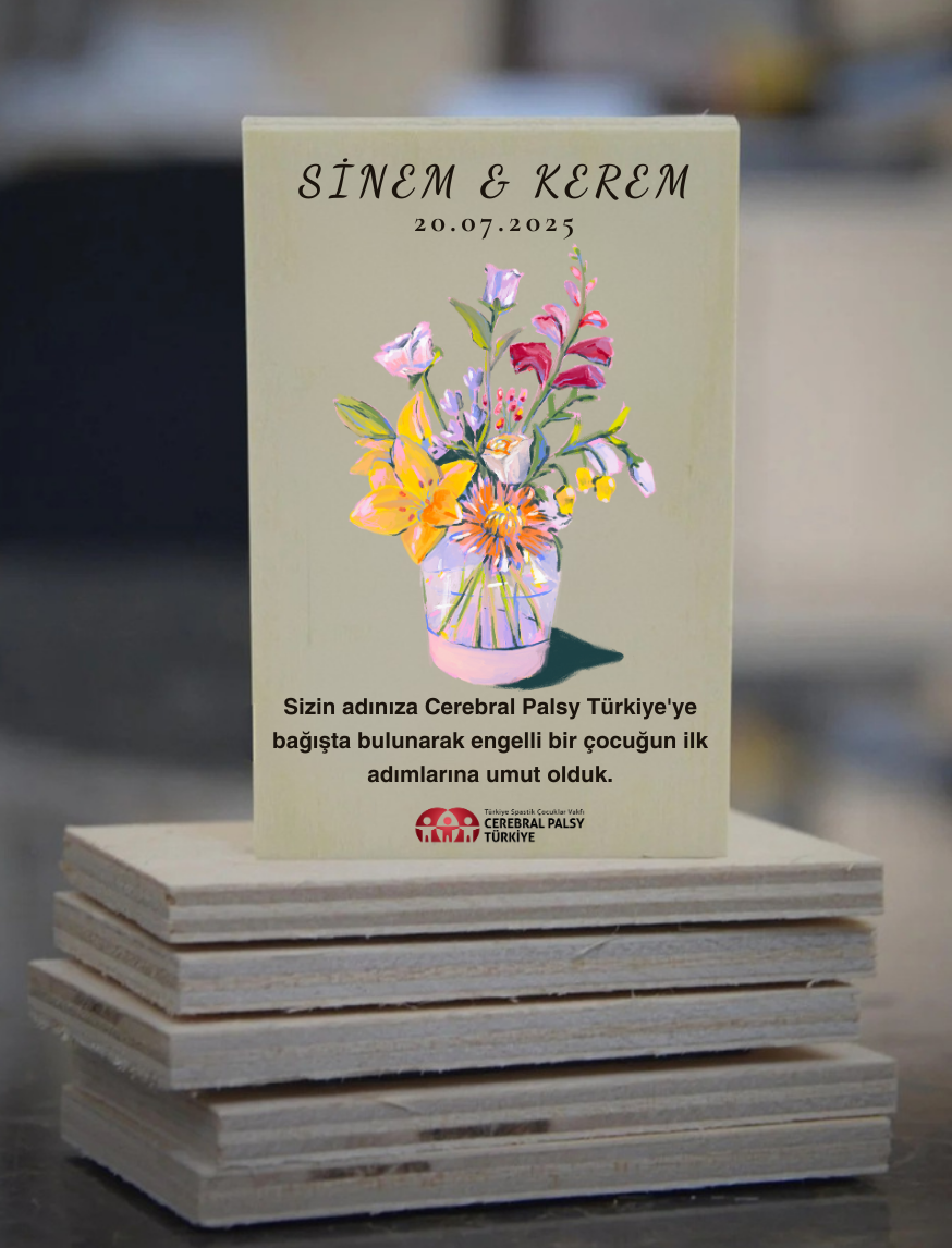 Türkiye Spastik Çocuklar Vakfı (Cerebral Palsy Türkiye) tarafından üretilen magnetler, doğal ahşap yüzeye isim–tarih ve seçtiğiniz desende yüksek kaliteli baskıyla işlenir. Arkasındaki güçlü mıknatıs metal yüzeylere sağlam tutunur. Her parça kişiye özel hazırlanır ve şık bir anı olarak yıllarca saklanır.