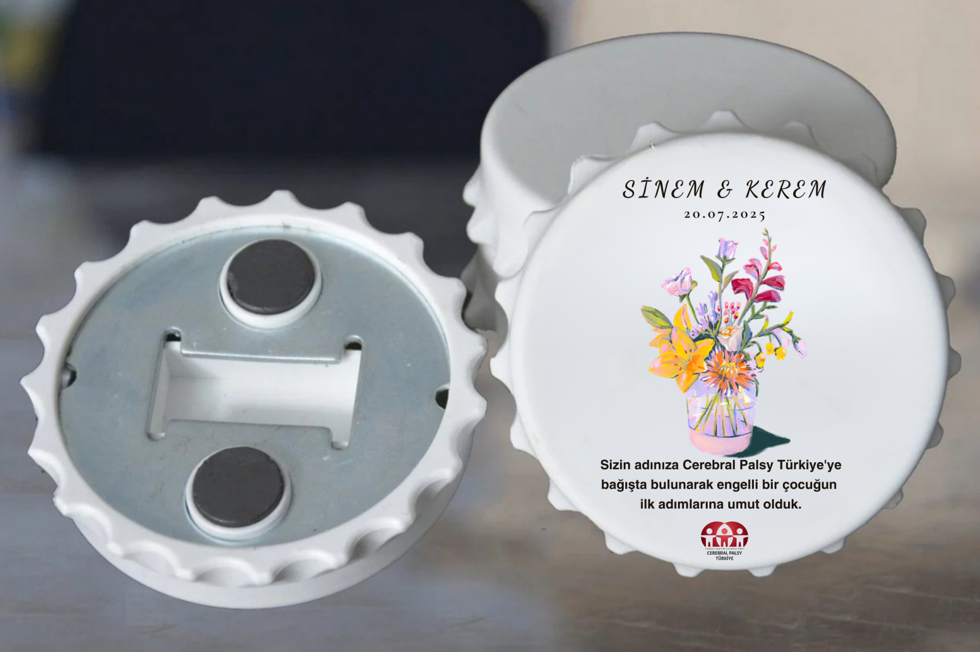 Türkiye Spastik Çocuklar Vakfı tarafından hazırlanan açacaklı nikah magnetleri, şık bir hatırayı anlamlı bir desteğe dönüştürüyor. Açacaklı nikah magnetleri güçlü mıknatıslı arka yüzeyi ile buzdolabına sağlam tutunur; entegre şişe açacağı ise günlük kullanıma pratiklik katar. İsim–tarih kişiselleştirmesi yapılır, Vakıf logosu ve “bağış” mesajı kart üzerinde yer alır.