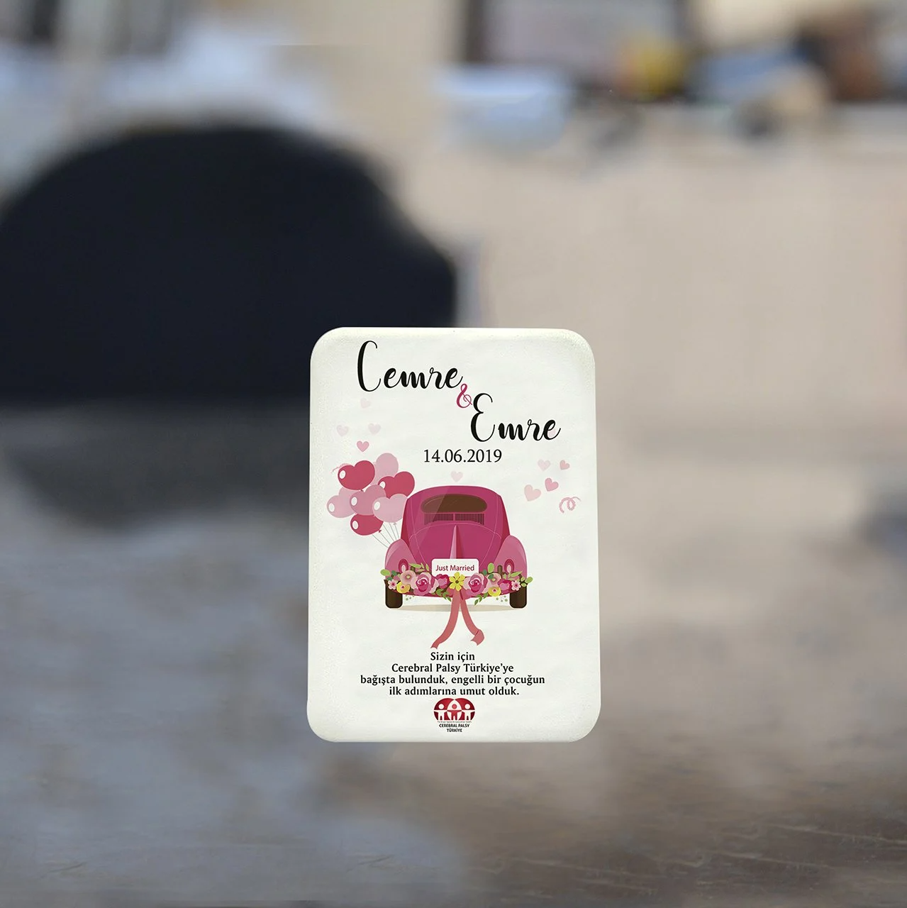 Türkiye Spastik Çocuklar Vakfı'nın parlak yüzeyli, dayanıklı plastikten üretilen magnetleri oval köşeli zarif formu ve güçlü mıknatısıyla buzdolabında yıllarca ilk günkü gibi kalır. İsim–tarih kişiselleştirmesi, okunaklı tipografi ve canlı baskı kalitesiyle düğün ve nişan anınızı şık bir hatıraya dönüştürür.